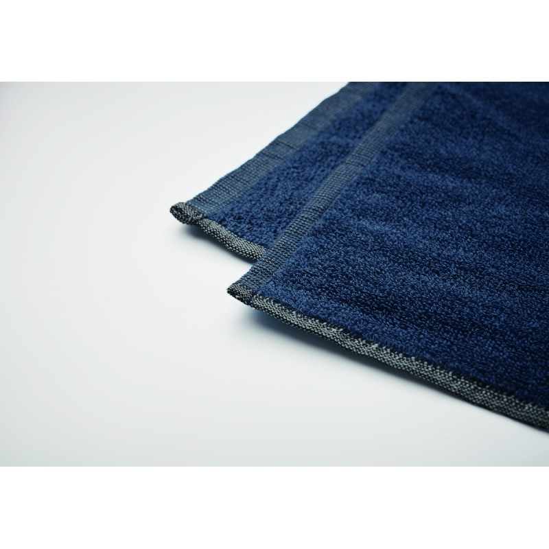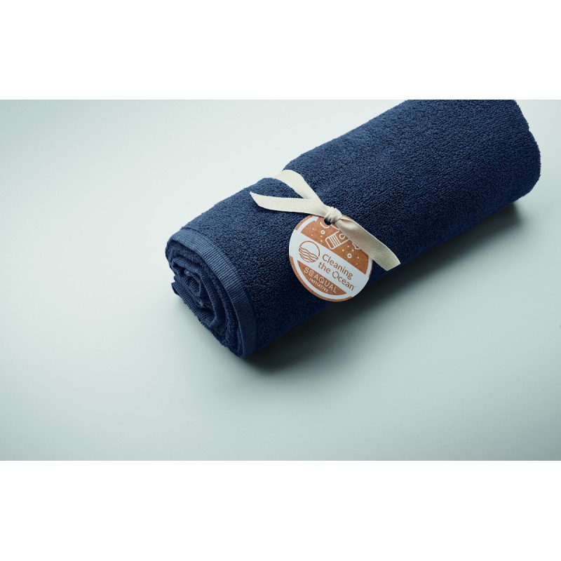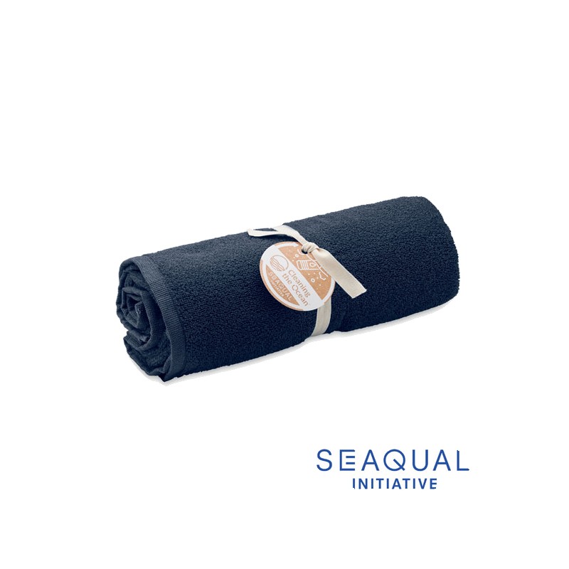 Serviette de bain ou de plage jacquard en tissu recyclé. 70% coton recyclé et 30% polyester recyclé polyester recyclé SEAQUAL®. 500 gr/m². 70x140 cm. L'INITIATIVE SEAQUAL travaille avec des organisations de nettoyage des océans dans le monde entier pour valoriser les déchets qu'elles récupèrent. Fabriqué dans l'UE.