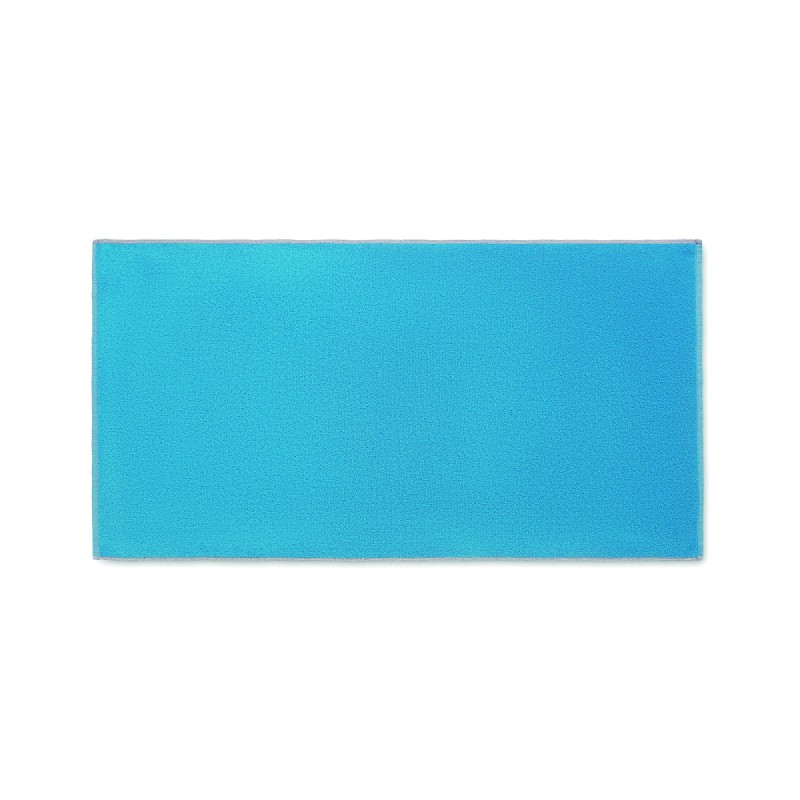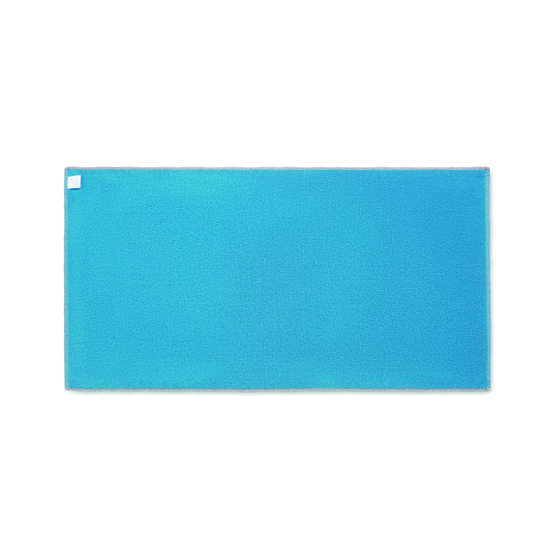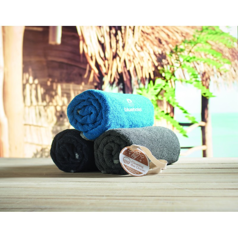 Serviette de bain ou de plage jacquard en tissu recyclé. 70% coton recyclé et 30% polyester recyclé polyester recyclé SEAQUAL®. 500 gr/m². 70x140 cm. L'INITIATIVE SEAQUAL travaille avec des organisations de nettoyage des océans dans le monde entier pour valoriser les déchets qu'elles récupèrent. Fabriqué dans l'UE.