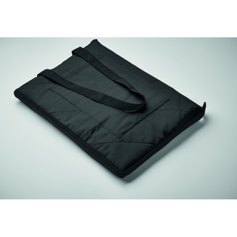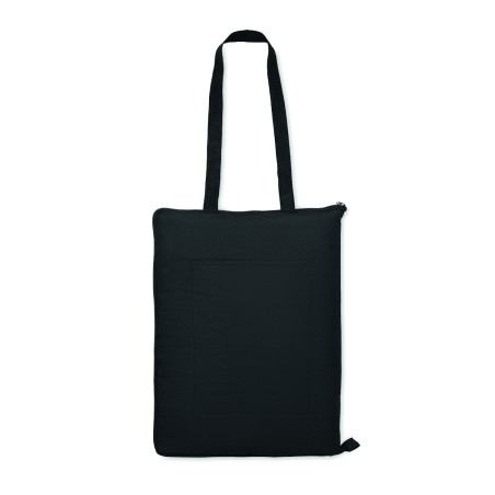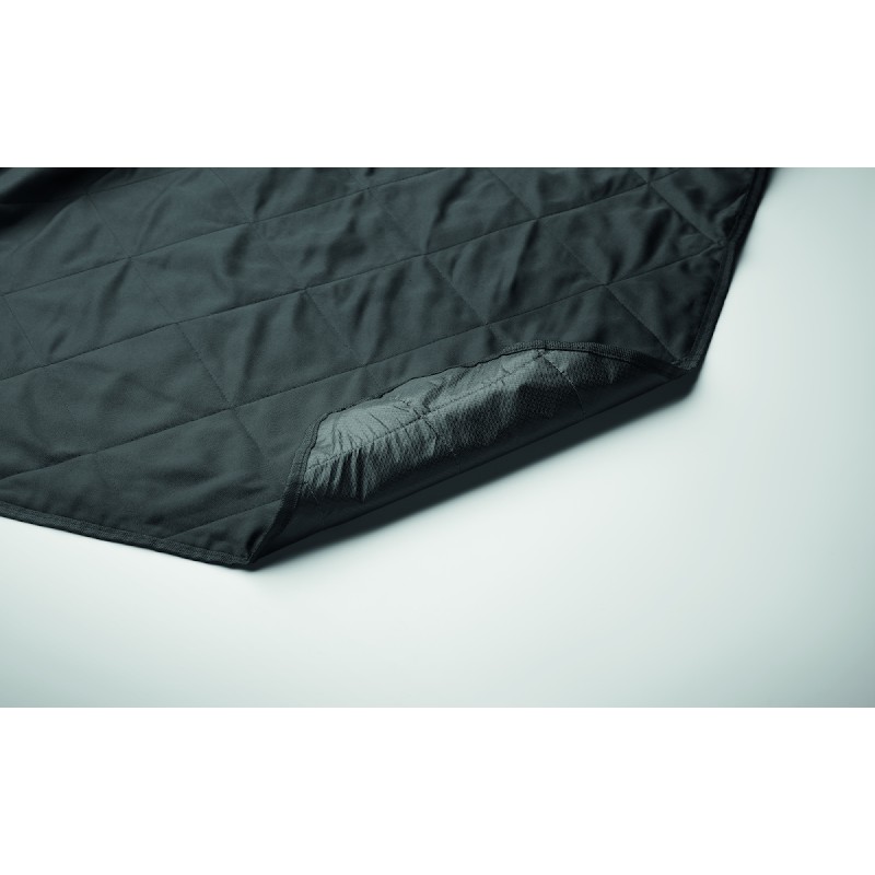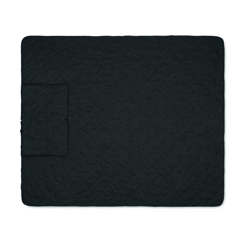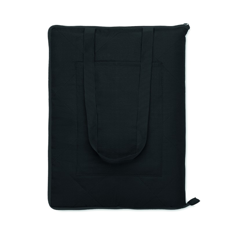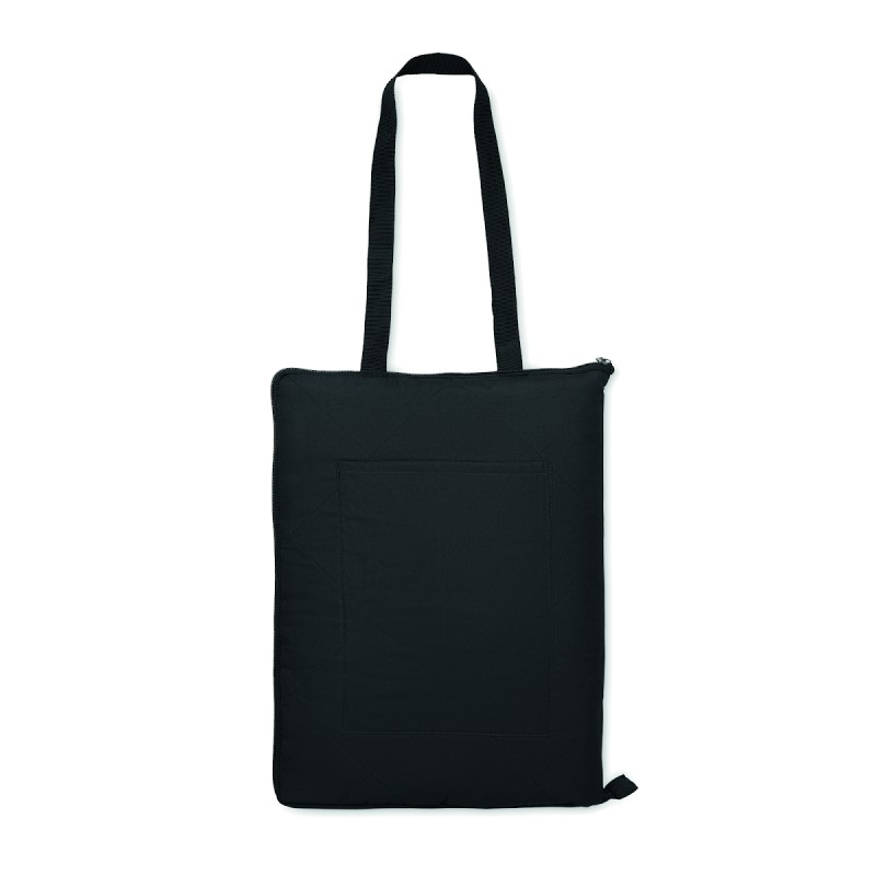 Couverture de pique-nique matelassée pliable avec PEVA plastifié au verso. Elle se plie en un sac fourre-tout pratique et dispose d'une bandoulière réglable. Comprend une grande poche frontale.
