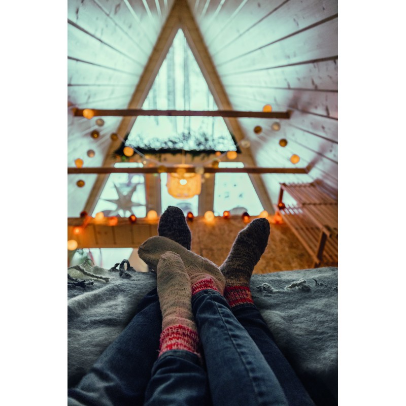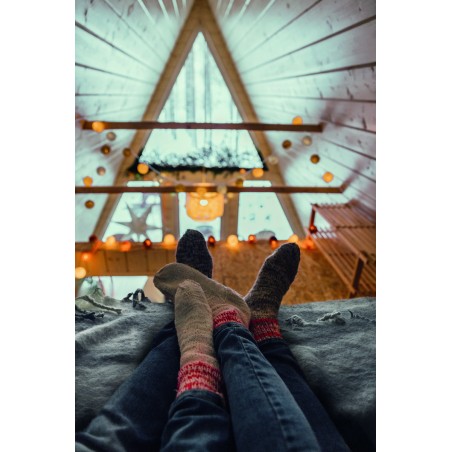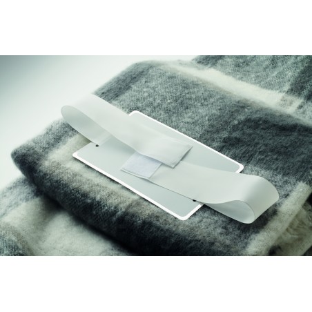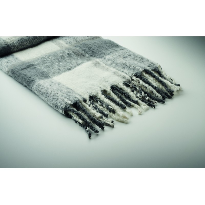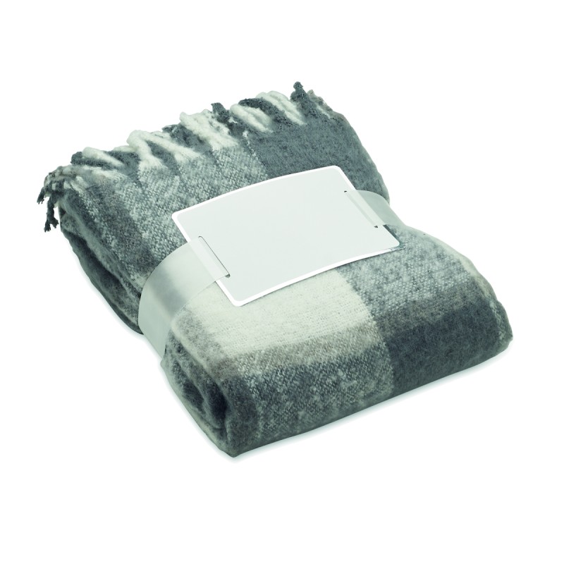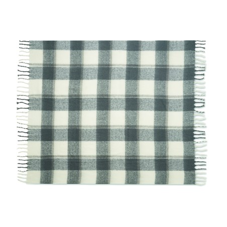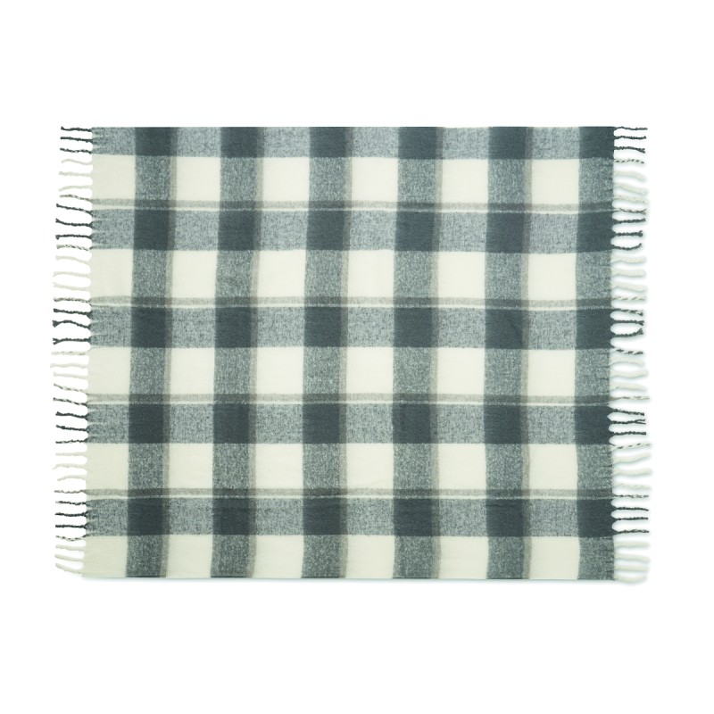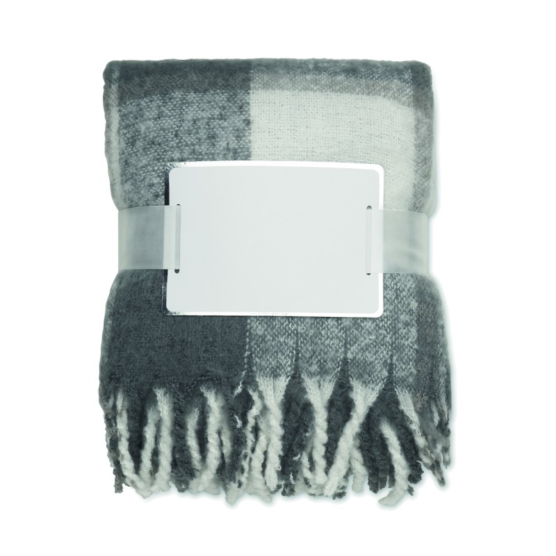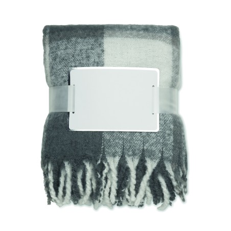 Couverture en RPET polyester mohair avec motifs à carreaux et franges . Enveloppée d'un ruban et d'une carte imprimable.