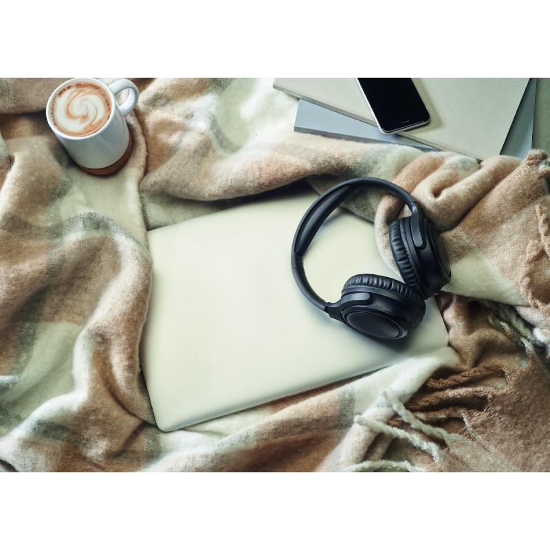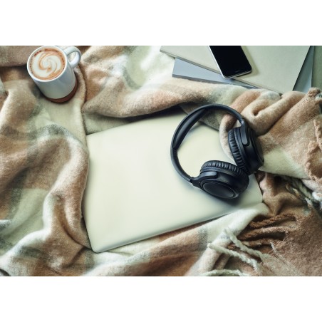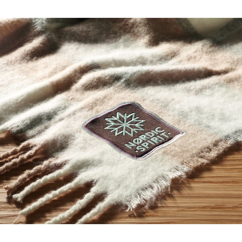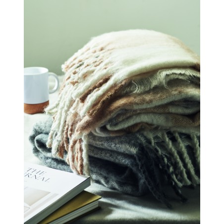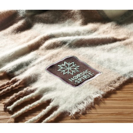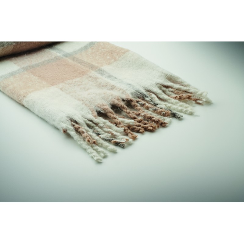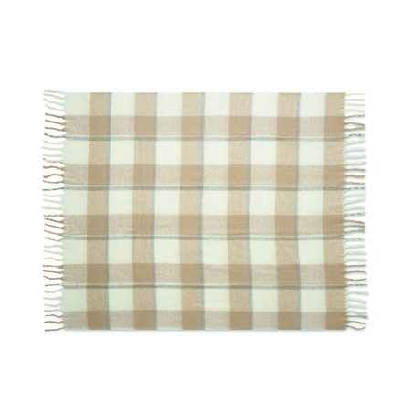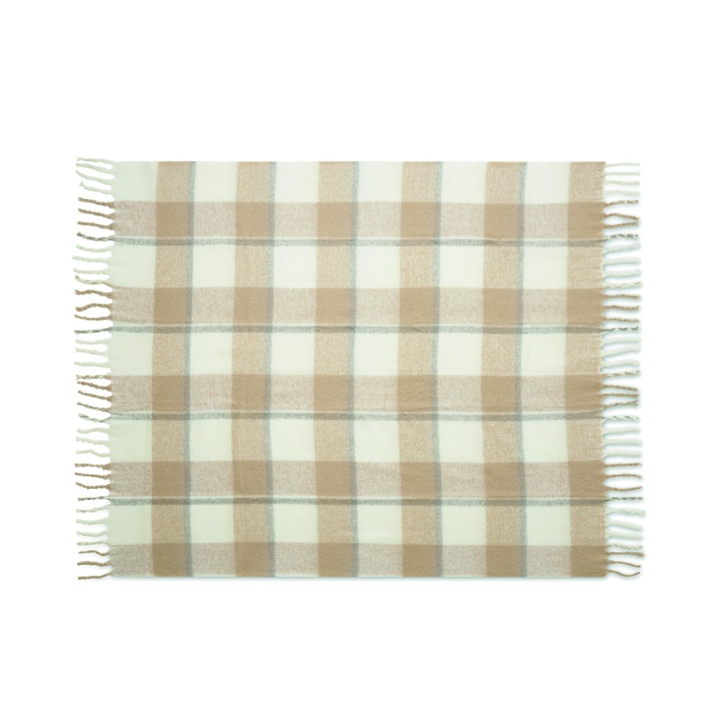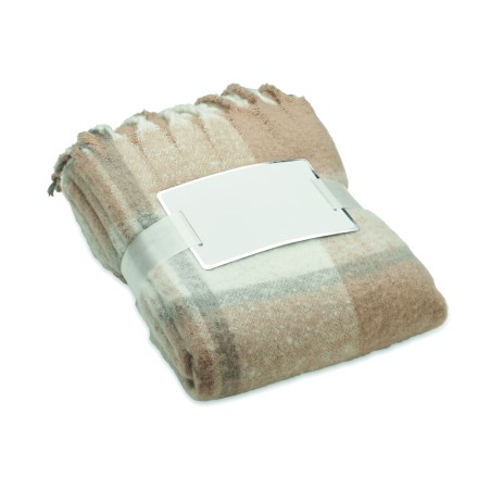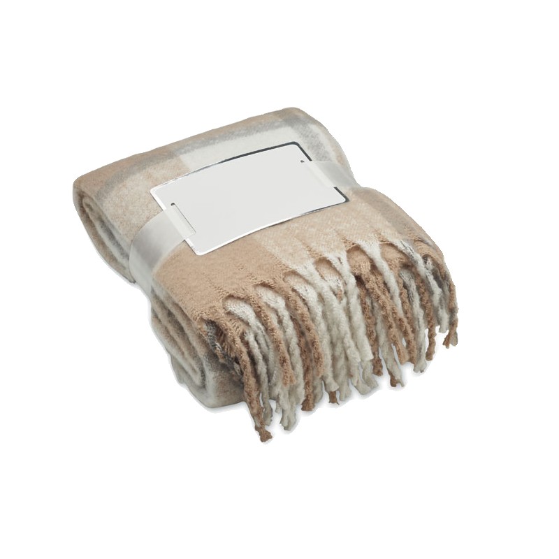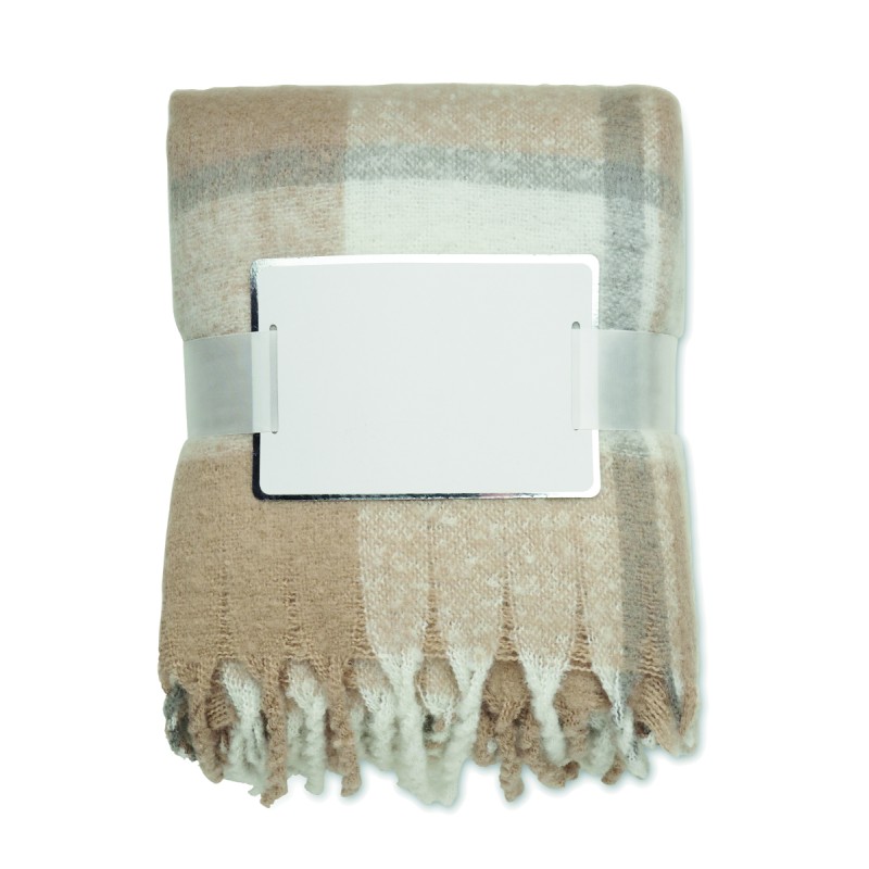 Couverture en RPET polyester mohair avec motifs à carreaux et franges . Enveloppée d'un ruban et d'une carte imprimable.