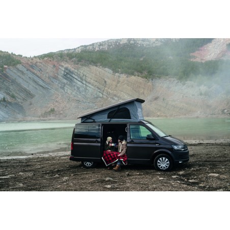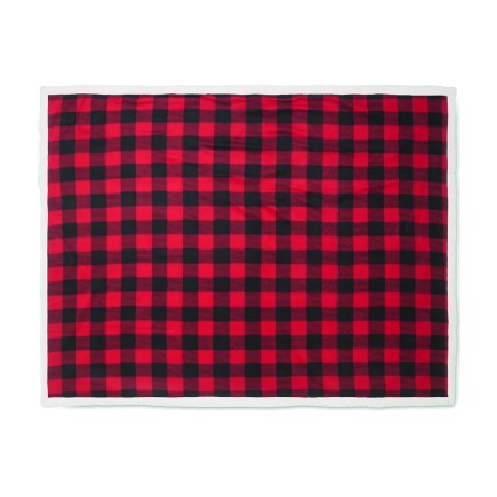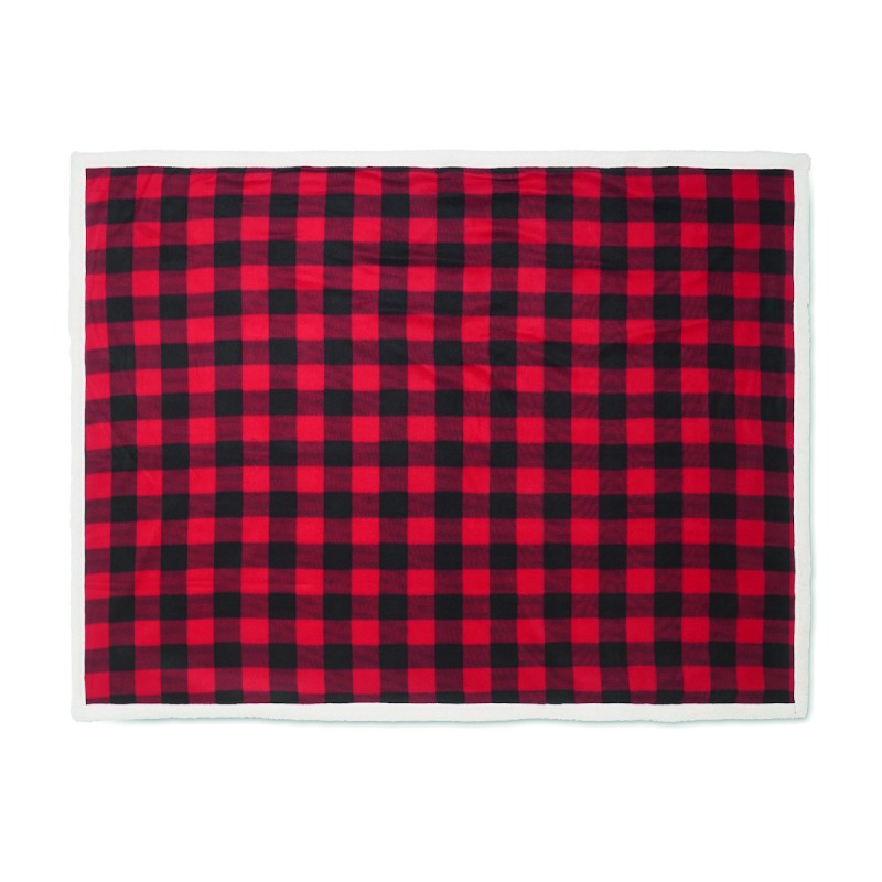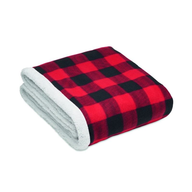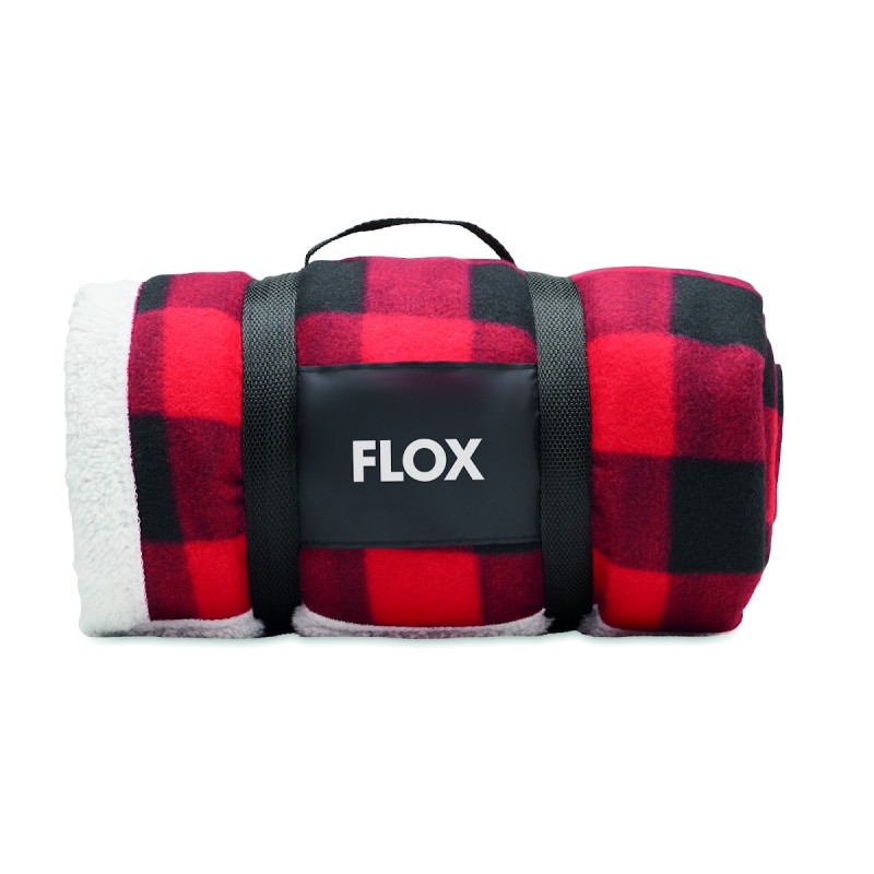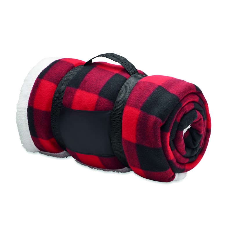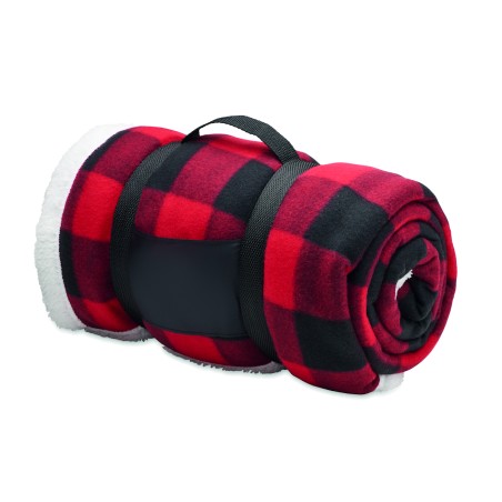 Couverture polaire doublée sherpa en RPET polaire (180 gr/m²) et polyester sherpa (230 gr/m²). Présentée dans une poignée de transport en nylon RPET.