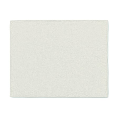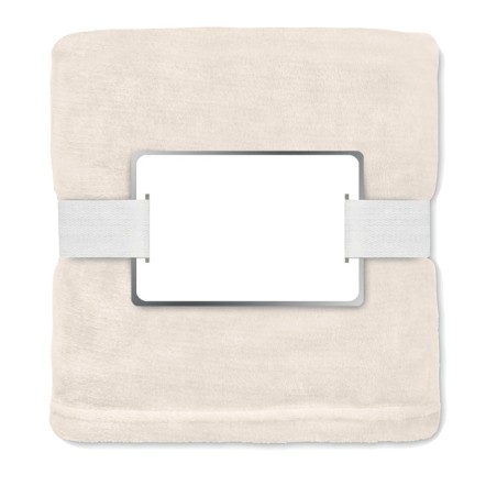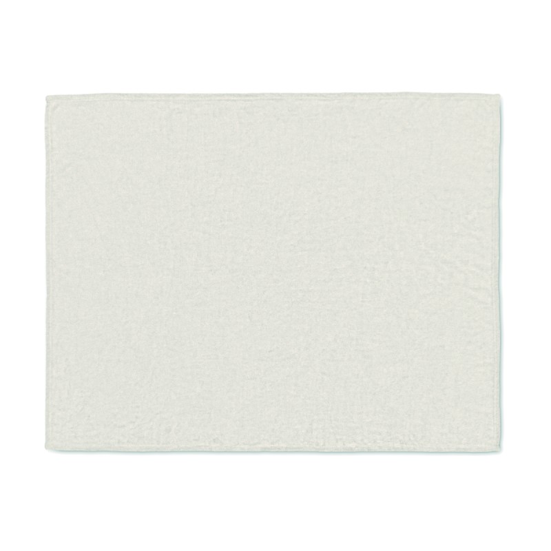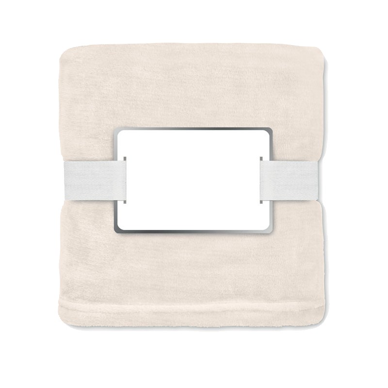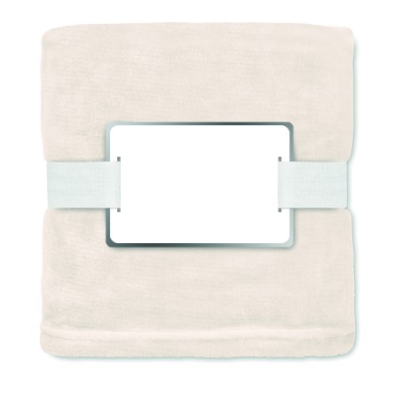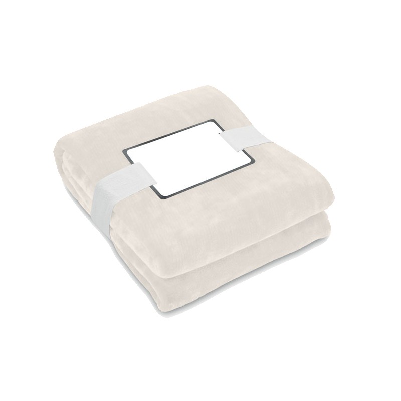 Couverture en polaire flanelle RPET 280 gr/m² enveloppée d'un ruban et d'une carte imprimable.