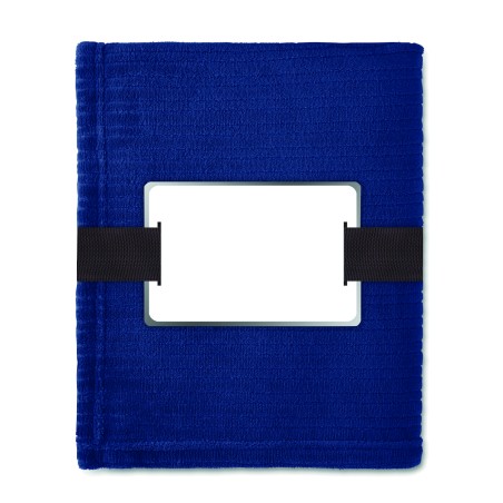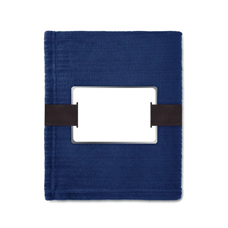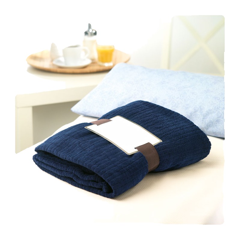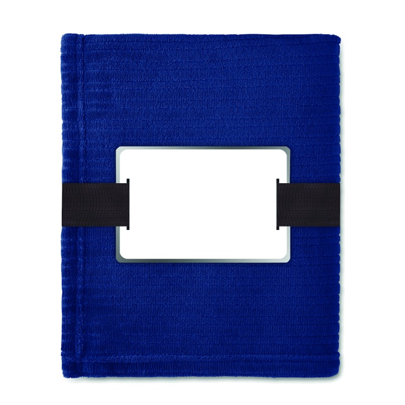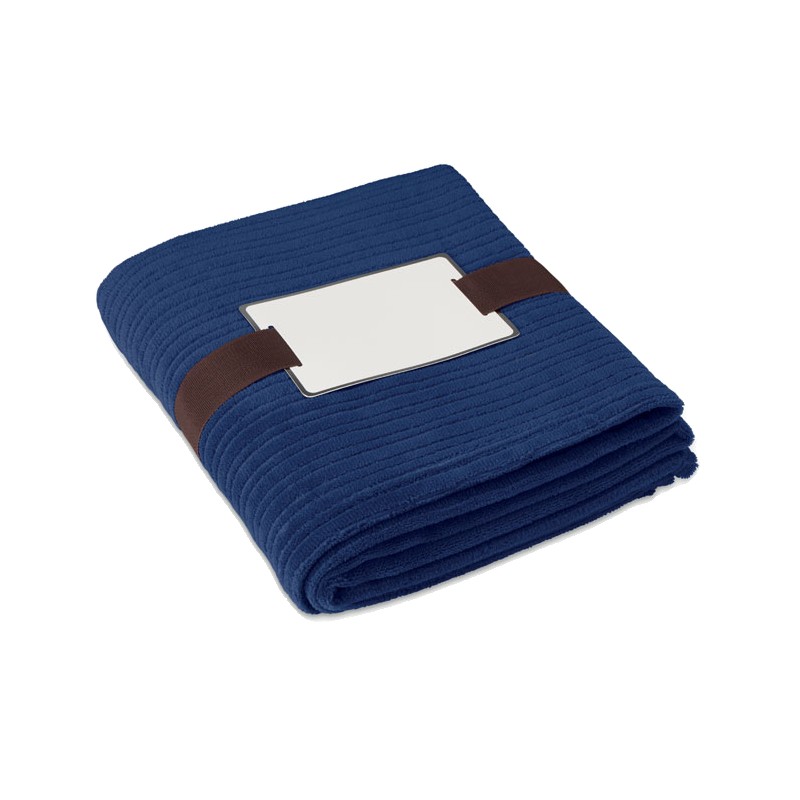 Couverture souple en polaire de 240 gr/m² enveloppée dans un ruban et carte imprimable.