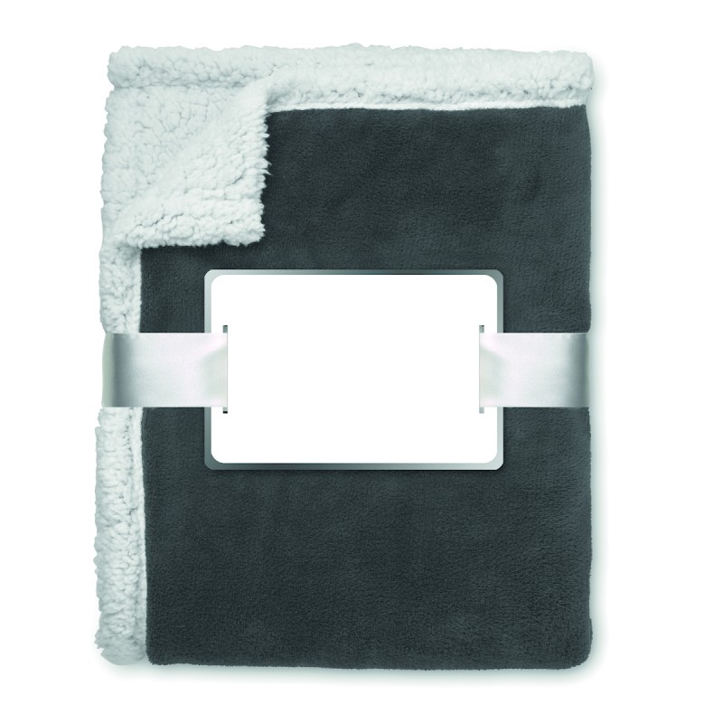 Couverture en polaire de 200 gr/m² avec doublure en polyester sherpa de 220 gr/m². Enveloppée dans un ruban et carte imprimable.