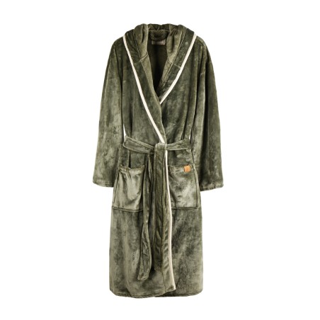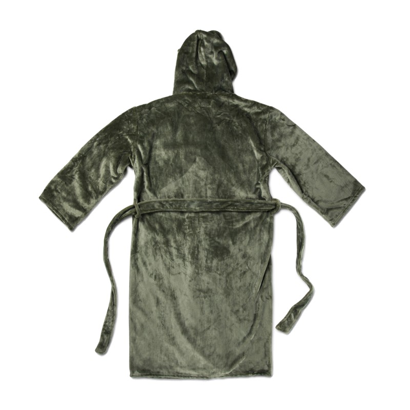 Robe de chambre douillette et douce en peluche de luxe avec grande capuche et passepoil décoratif. Deux poches à l'avant et ceinture à la taille. La robe de chambre est fabriquée à partir de 68 % de matériaux recyclés vérifiés. Comme nous n'aimons pas transporter de l'air, nous avons choisi de mettre sous vide cette robe de chambre pour réduire notre empreinte carbone. Fabriqué selon la norme GRS (Global Recycled Standard) La certification GRS garantit que toute la chaîne d'approvisionnement des matériaux recyclés est certifiée. Le contenu recyclé total est basé sur le poids total du produit. Taille S/M. OEKO-TEX® STANDARD 100. 19.HCN.76049. Hohenstein HTTI.