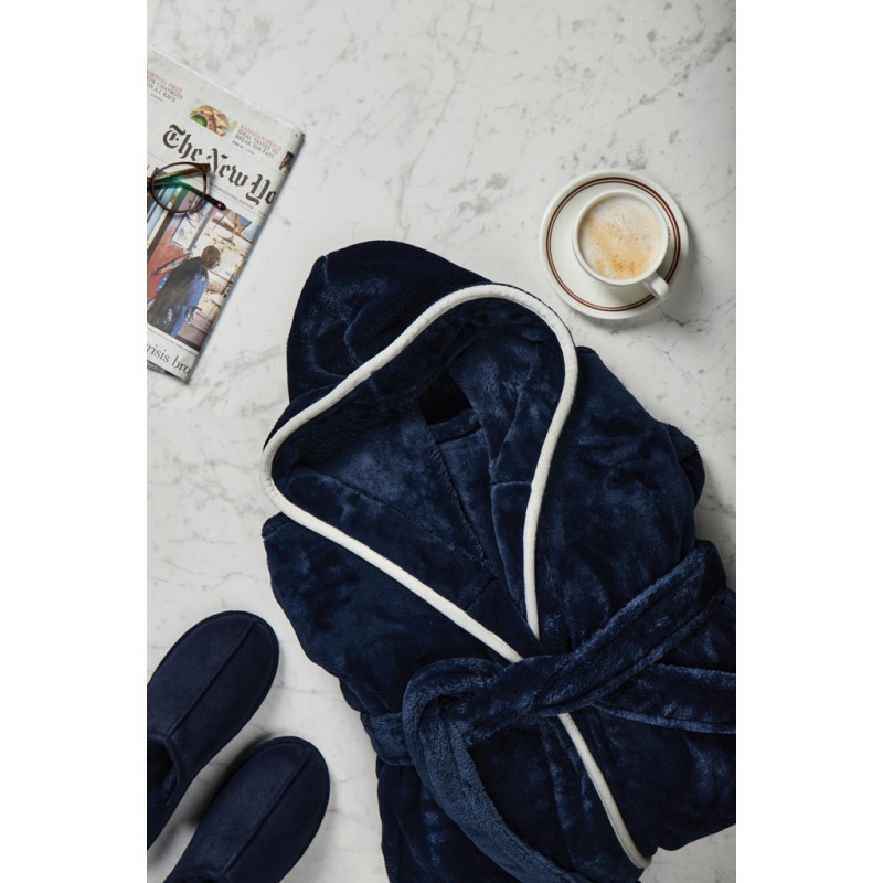 Robe de chambre douillette et douce en peluche de luxe avec grande capuche et passepoil décoratif. Deux poches à l'avant et ceinture à la taille. La robe de chambre est fabriquée à partir de 68 % de matériaux recyclés vérifiés. Comme nous n'aimons pas transporter de l'air, nous avons choisi de mettre sous vide cette robe de chambre pour réduire notre empreinte carbone. Fabriqué selon la norme GRS (Global Recycled Standard) La certification GRS garantit que toute la chaîne d'approvisionnement des matériaux recyclés est certifiée. Le contenu recyclé total est basé sur le poids total du produit. Taille L/XL. OEKO-TEX® STANDARD 100. 19.HCN.76049. Hohenstein HTTI.