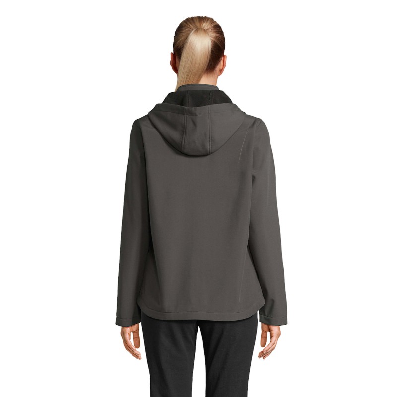 SOL'S RACE HOODED WOMEN, VESTE CAPUCHE SOFTSHELL FEMME, 100% polyester recyclé Intérieur polaire : 100% polyester recyclé 2 couches,Ouverture principale et poches latérales avec zip nylon noir Tir-zip noirs Capuche avec cordon de serrage Dos légèrement rallongé. Pour la correspondance des tailles, veuillez vous référer au size chart dans la documentation produit.