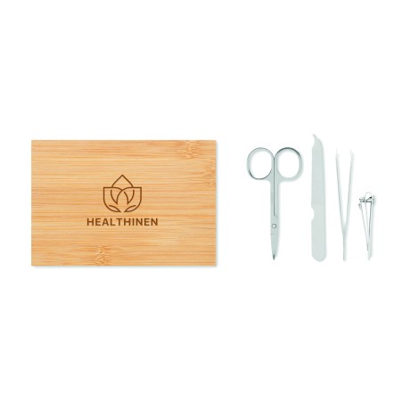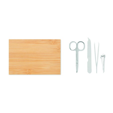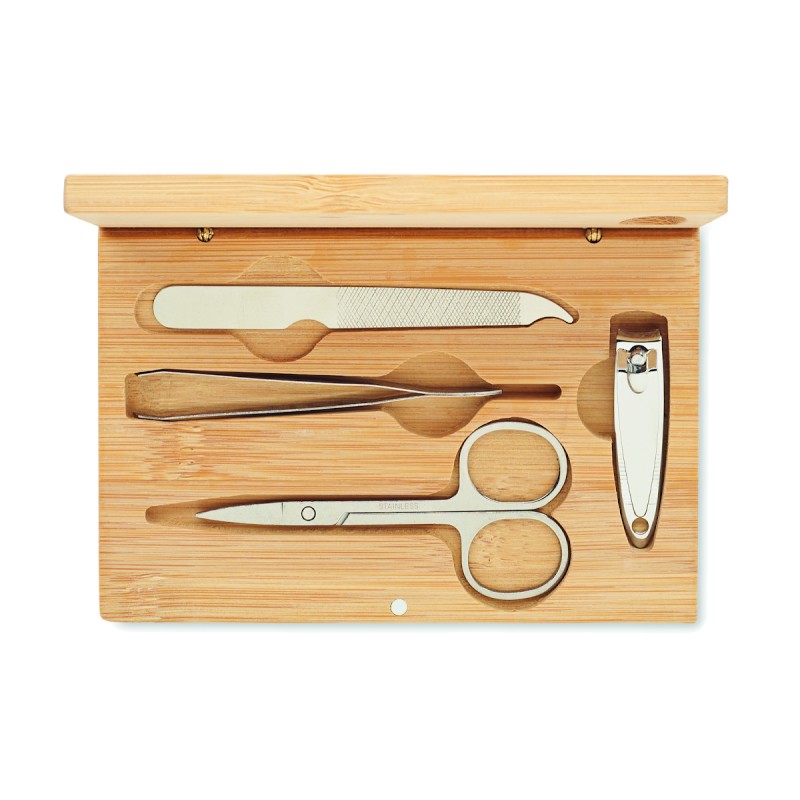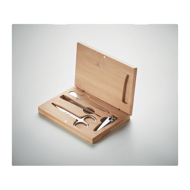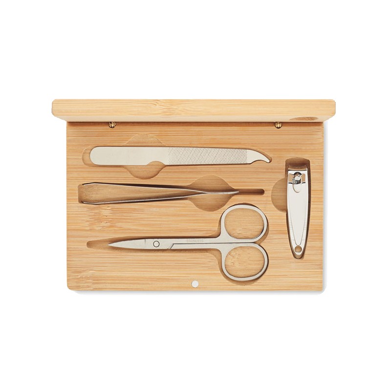 Set manucure 4 pièces en acier inoxydable dans un étui en bambou avec fermeture magnétique. Comprenant : ciseaux à ongles courbes, coupe-ongles, lime à ongles et pince à épiler. Le bambou est un produit naturel, et présente de légères variations de couleur, de décoration et de tailles.