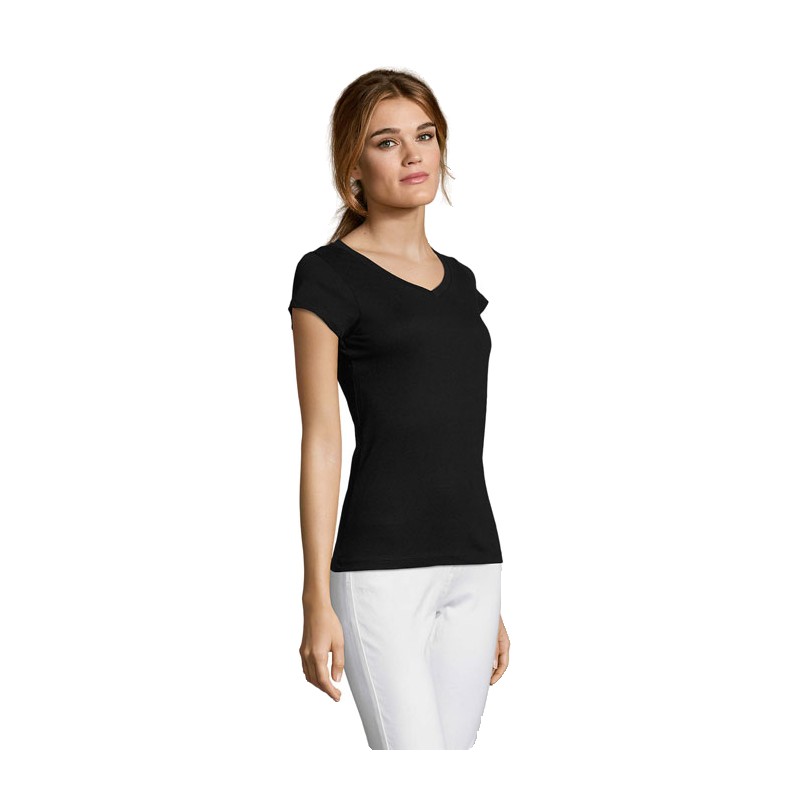 SOL'S MOON, tee-shirt femme col "v", 100% coton semi-peigné ringspun jersey 150, bande de propreté au col, manches courtes, coupe cintrée, col "v" en bord côte élasthanne, coupé cousu, (1) gris chiné : 85 % coton / 15 % viscose. Pour la correspondance des tailles, veuillez vous référer au size chart dans la documentation produit.