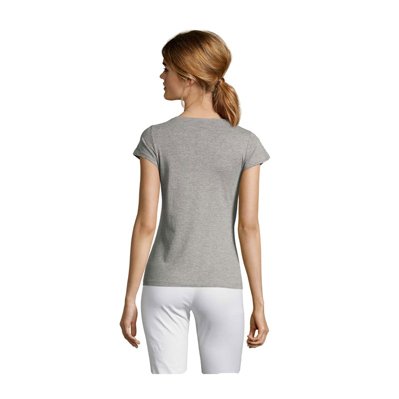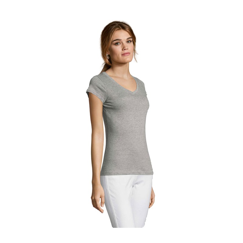 SOL'S MOON, tee-shirt femme col "v", 100% coton semi-peigné ringspun jersey 150, bande de propreté au col, manches courtes, coupe cintrée, col "v" en bord côte élasthanne, coupé cousu, (1) gris chiné : 85 % coton / 15 % viscose. Pour la correspondance des tailles, veuillez vous référer au size chart dans la documentation produit.