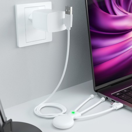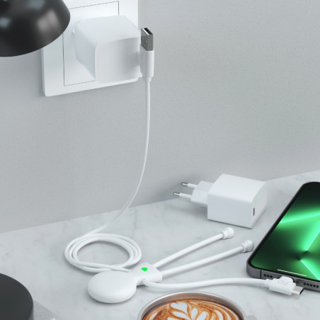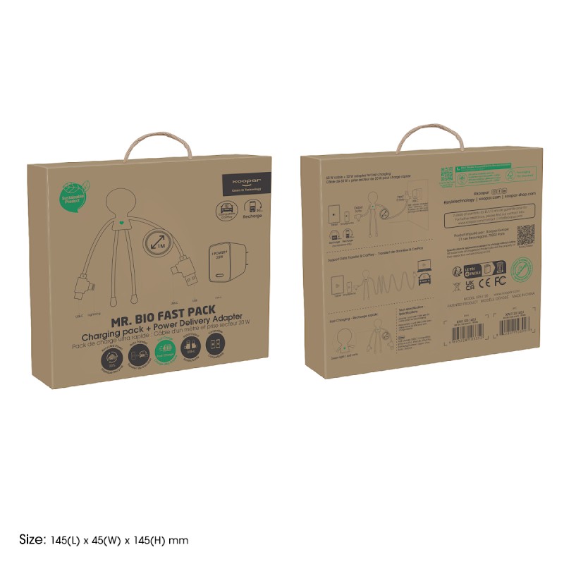 Le pack fun et attachant pour chargement rapide ! Chargez vos appareils de manière rapide et simple grâce au Mr Bio Fast Pack où que vous soyez. Pour les specs : Câble d'un mètre de longueur : Multi-câbles d'un mètre de long Entrée : USB-C et USB Sortie : Lightning, USB-C Transfert de données Chargement rapide (60W) avec indicateur lumineux : le coeur s'allume et une Led verte apparaît Fonctionnalité CarPlay Compatible avec tous les appareils dernière génération Adaptateur : Entrée USB-C Prise secteur 20 W pour charge rapide Compatibilité Iphone >8+, iPad Aire, Ipad Pro, Samsung, Huawei, Oppo, Vivo, Sony, Xiaomi' Produit : Recharge 50% de votre smartphone en 30 minutes Produit garantie 2 ans Le câble d'un mètre de longueur pour chargement rapide est développé dans une démarche de progrès. On vous explique tout : 20% du volume total du câble est fabriqué à partir de plastique recyclé Packaging en papier certifié FSC issu d'une exploitation forestière, disposant d'une gestion durable Matières : 47% Recycled ABS 53% Recycled TPE Marquage : Made in France Encres certifiées NF71.3 Tampo 1 couleur et + (numérique) Possibilité de marquage une position sur les 2 produits