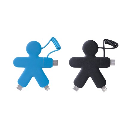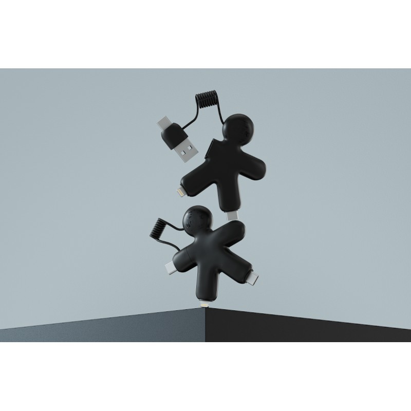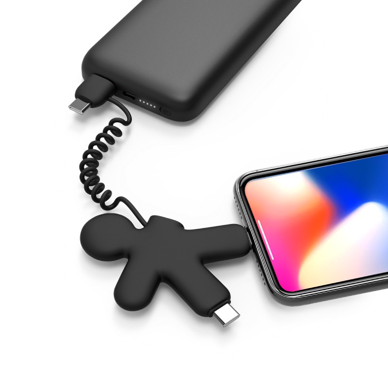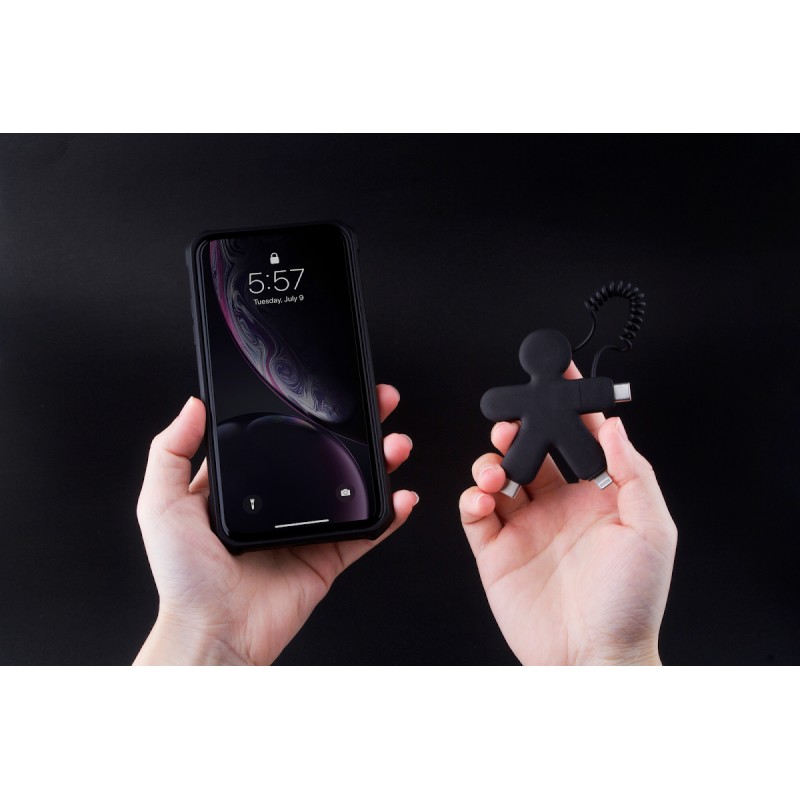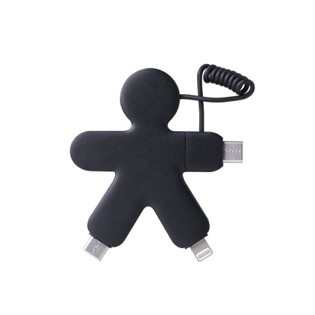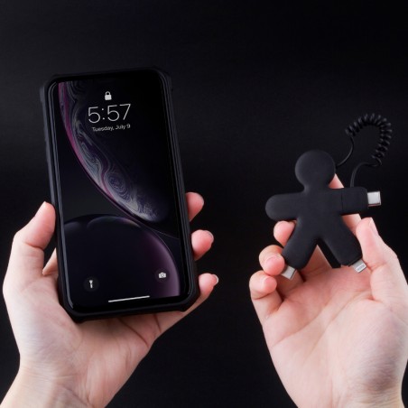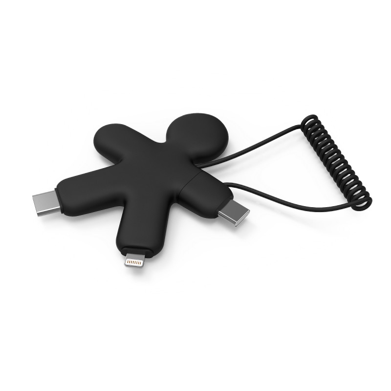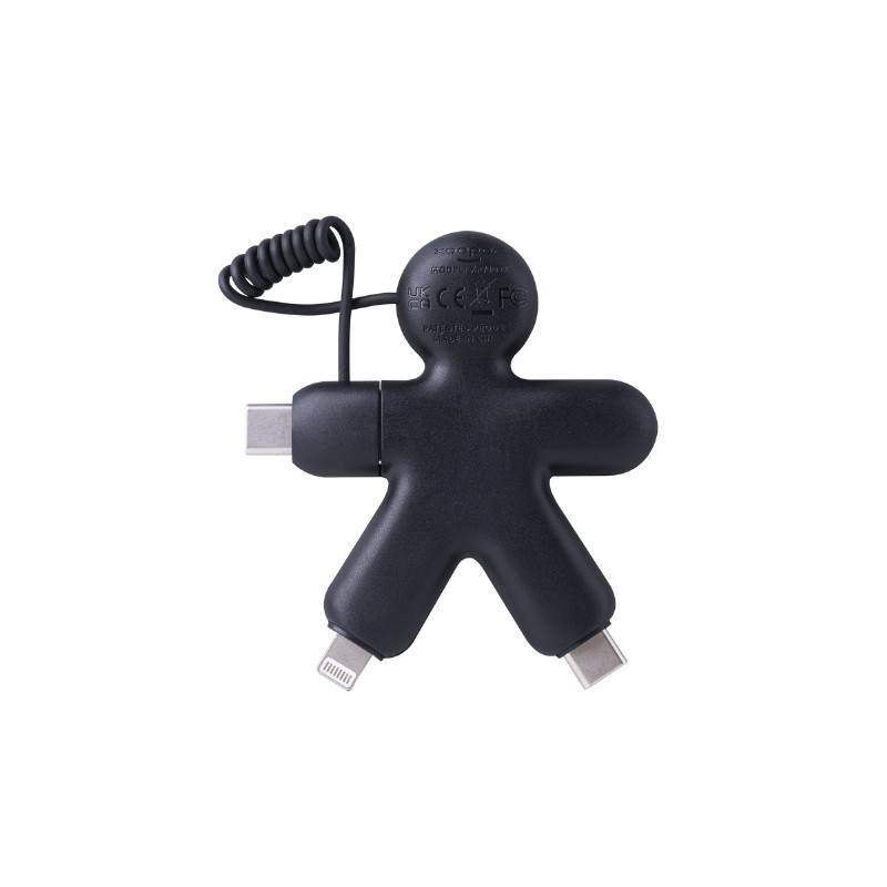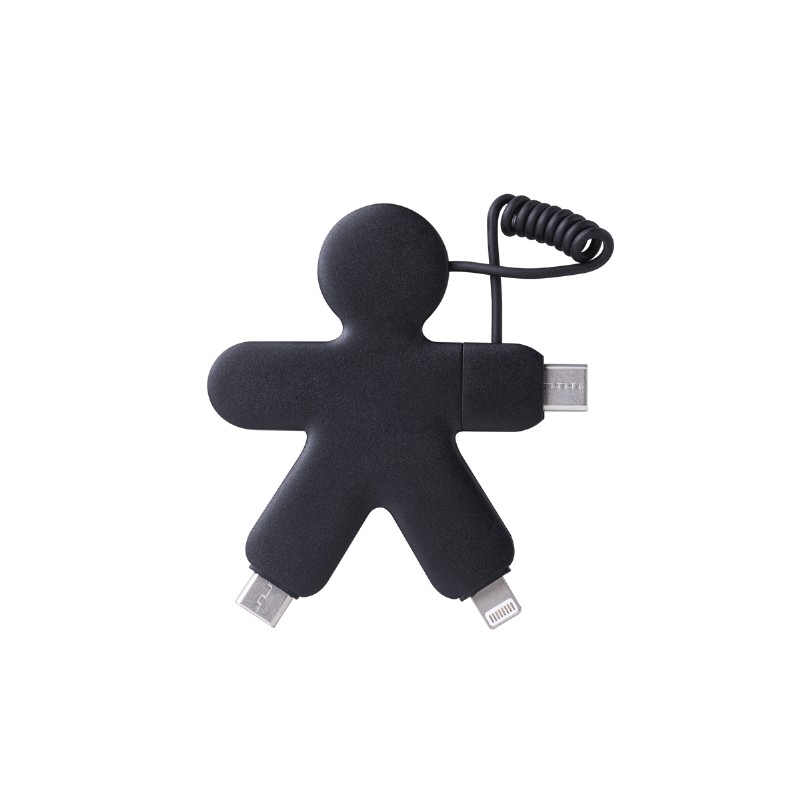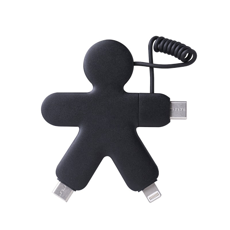 Ce câble multiconnecteur en forme de bonhomme, toujours prêt à recharger vos appareils, est développé dans une démarche de progrès.