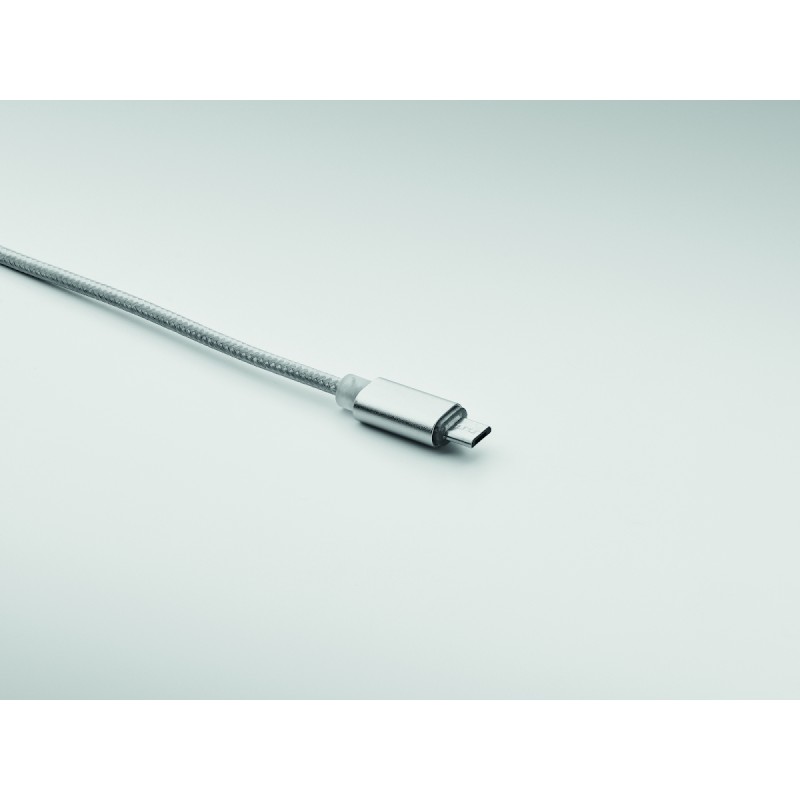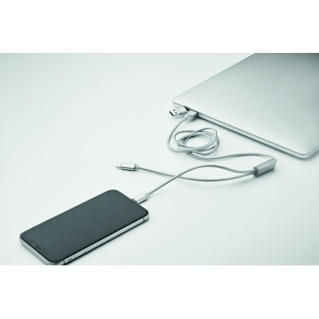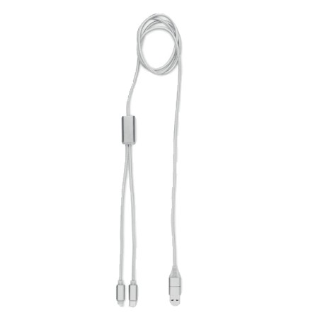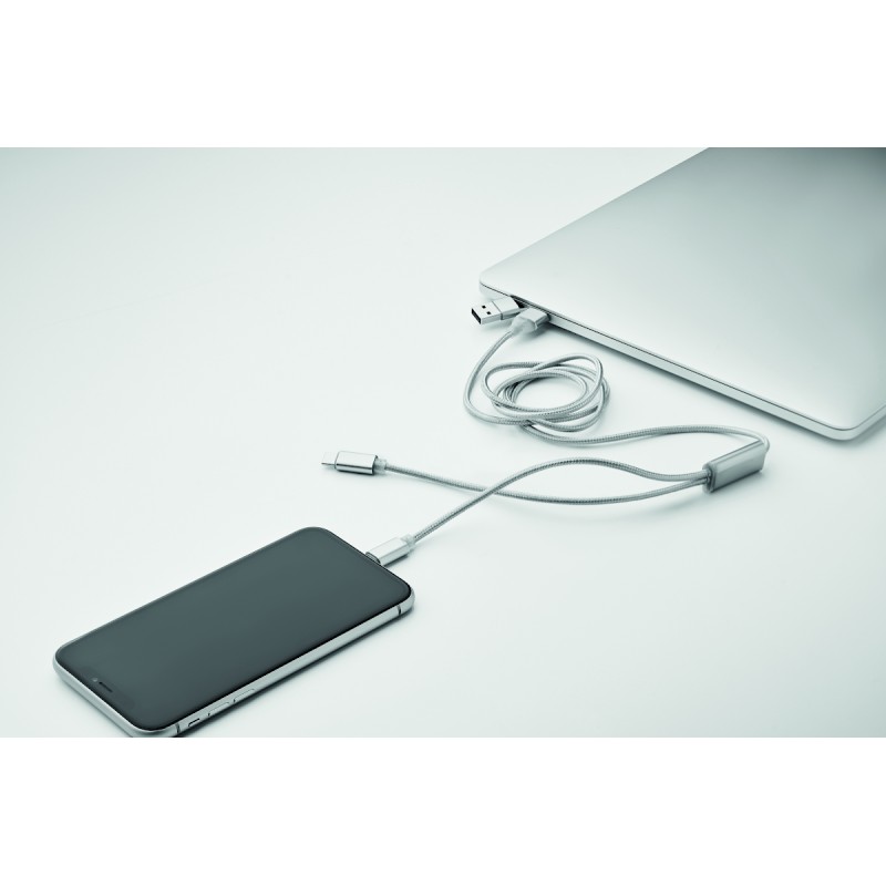 Câble de recharge en aluminium avec entrée : 2-en-1 type-C & type-A et micro-B (2 en 1 pin), sortie type C et micro B. Longueur du câble : 120 cm.