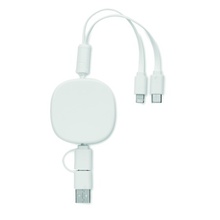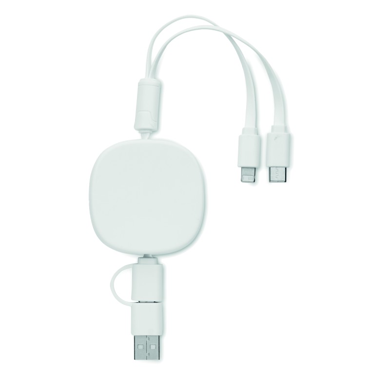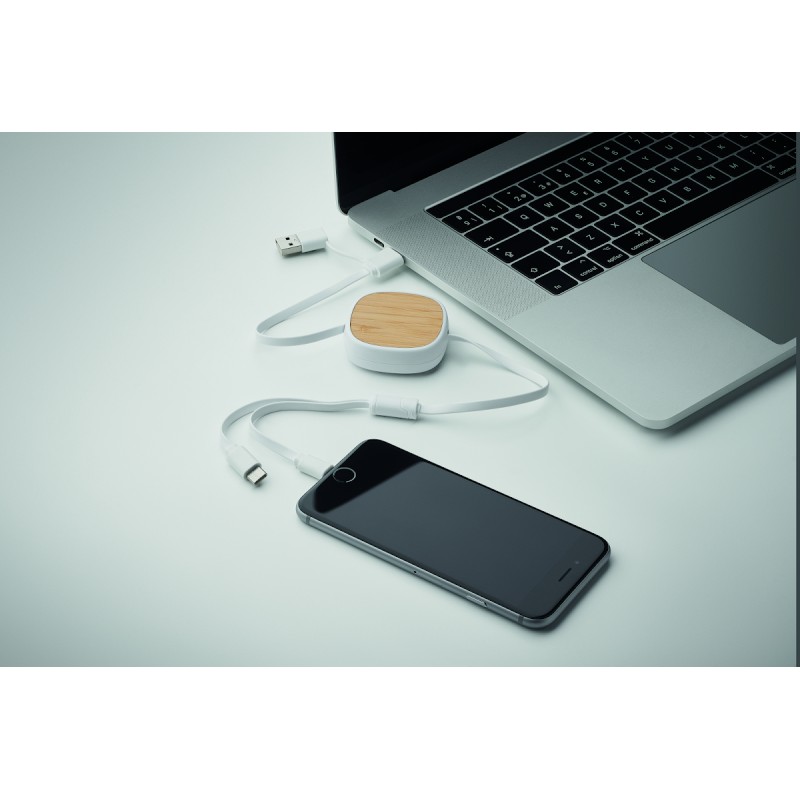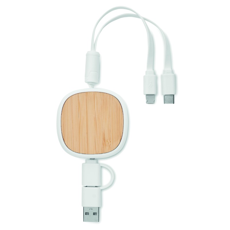Câble de charge rétractable multi-USB en ABS avec détails en bambou sur le dessus. Entrée : 2-en-1 Type-C et Type-A. Sortie : Type-C et 2-en-1 micro USB et connecteur. Longueur du câble : 90 cm.