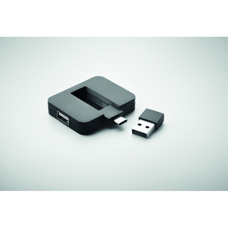 HUB 4 ports USB 2.0 en ABS. Sortie : 2 x Type-A et 2 x Type-C. Entrée : Type-C et Type-A.