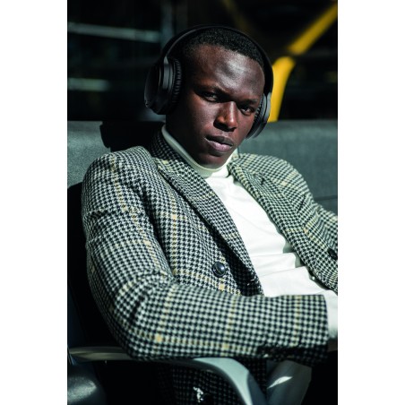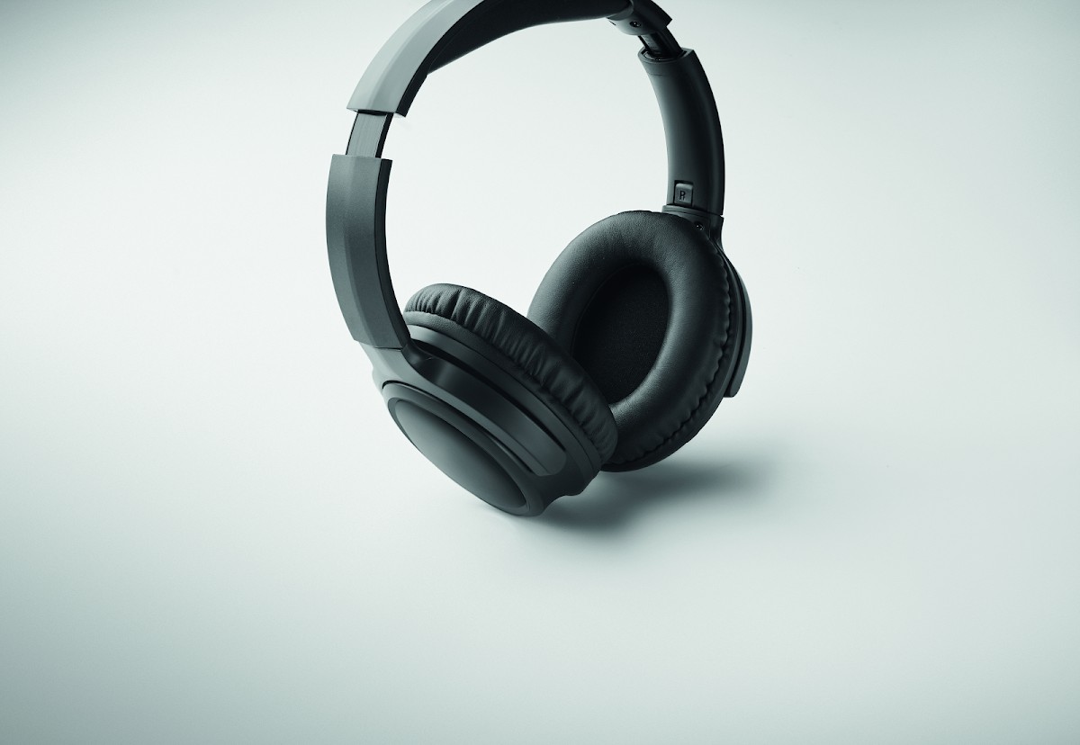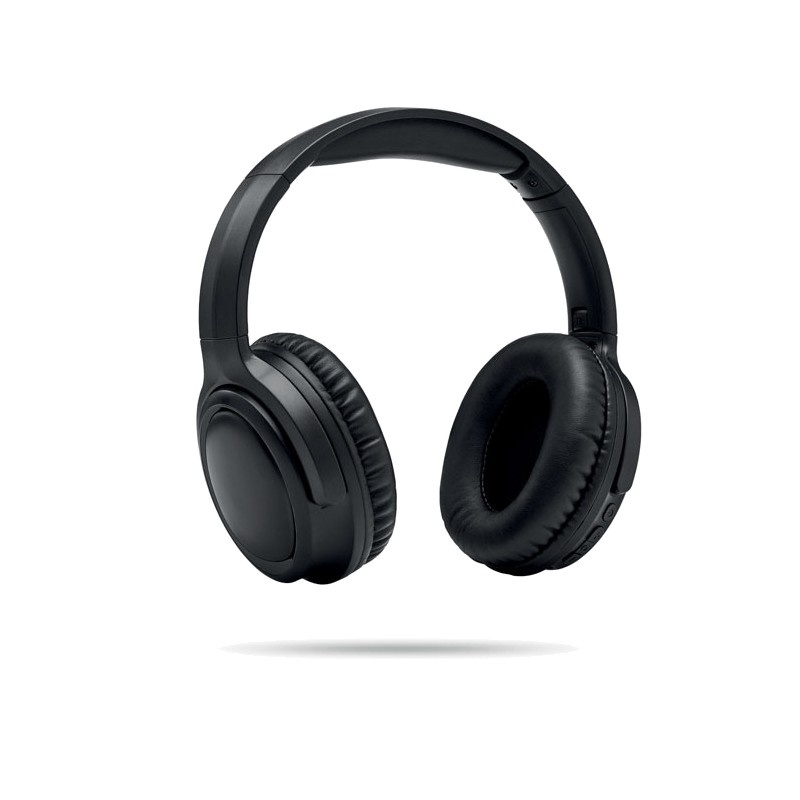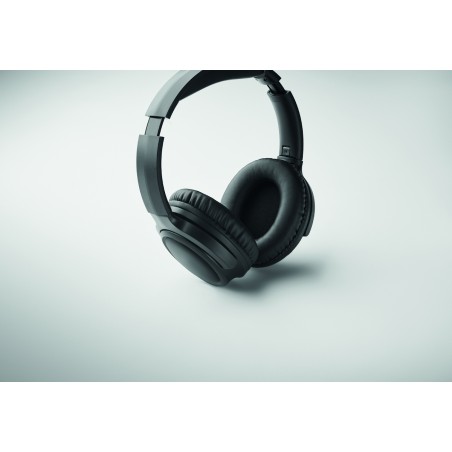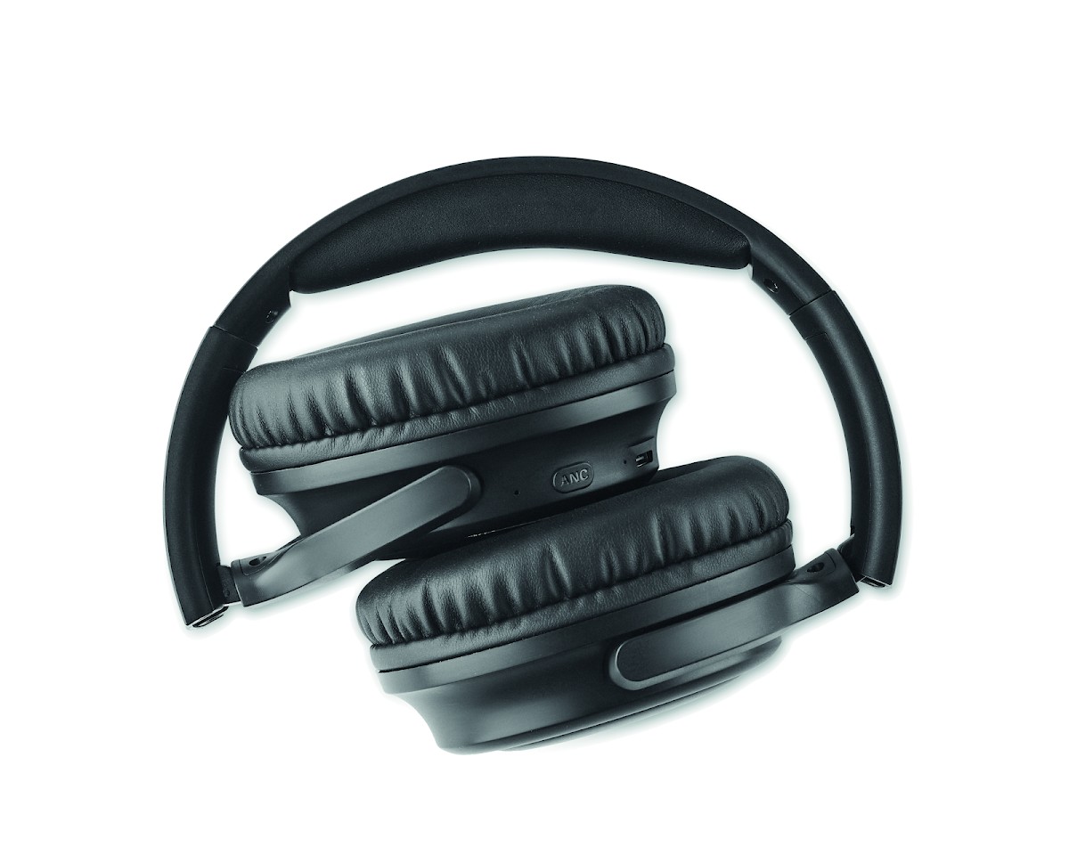Casque sans fil pliable en ABS à réduction active du bruit (ANC) 5.3. Fonction mains libres et microphone. Autonomie d'env 17 heures. Câble de chargement Type-C inclus. Batterie Li-ION rechargeable de 200 mAh. Portée : 10 m.