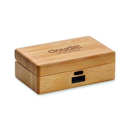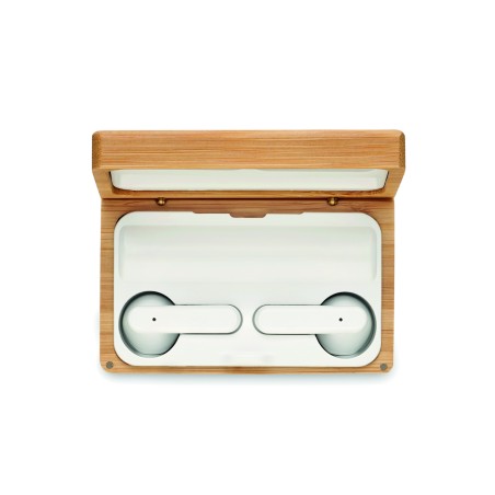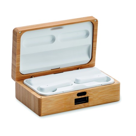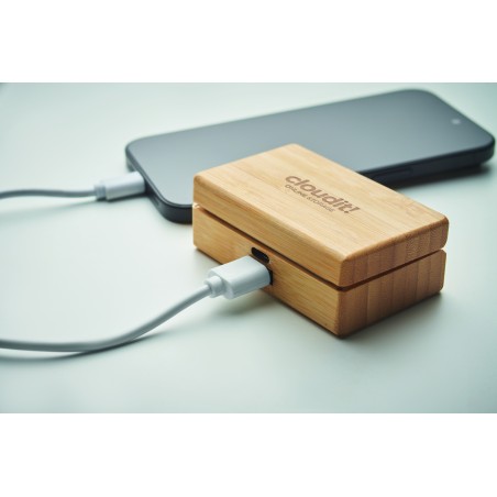 Oreillettes TWS avec microphone dans un étui en bambou. Comprend un powerbank de 1200 mAh avec entrée type C et sortie type C et type A. Appairage automatique.