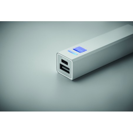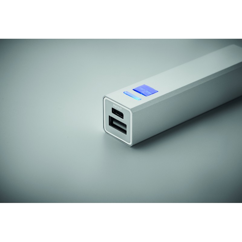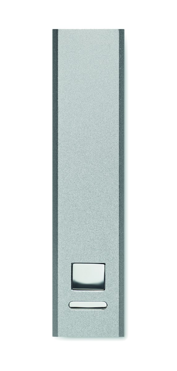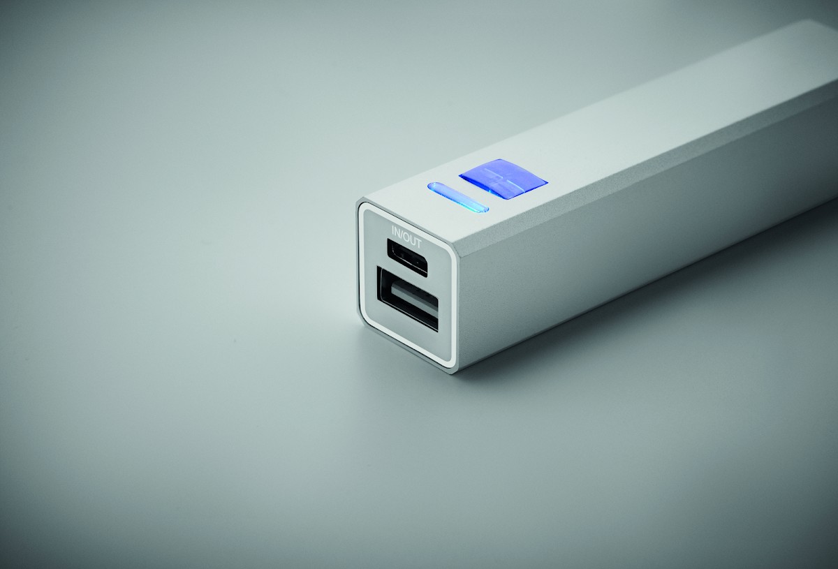 Powerbank 2600 mAh dans un boîtier en aluminium recyclé. Capacité pour l'utilisation d'un smartphone, courant sortant DC5V/1A. Câble de charge USB Type-C avec adaptateur Type-A inclus. Entrée/sortie : USB Type-C.