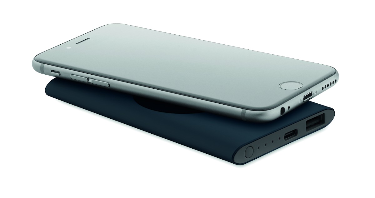 Powerbank 5000 mAh en aluminium recyclé avec recharge sans fil 15W. Entrée : Type-C. Sortie : 1 x Type-C & 1 x Type-A. Courant de sortie DC5V/2A.