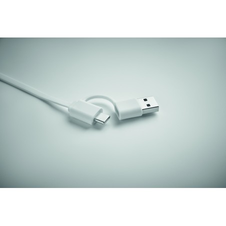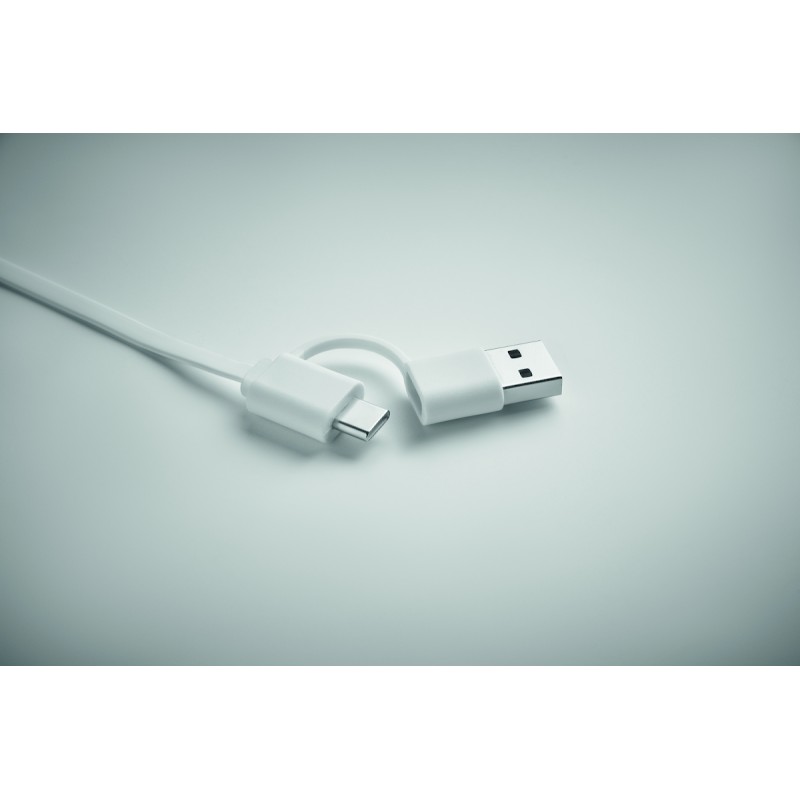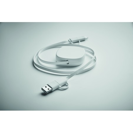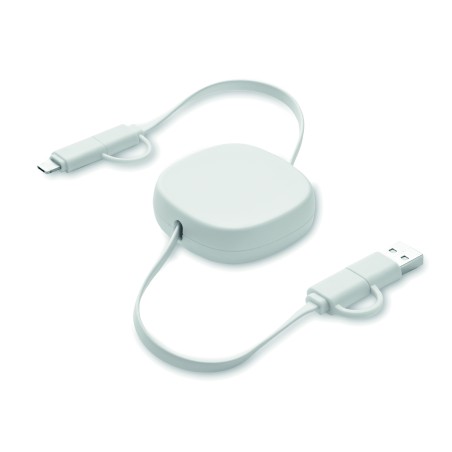 Câble rétractable de 60W dans un boîtier en ABS recyclé. Entrée : 2-en-1 Type-C et Type-A. Sortie : Type-C et micro-B (2 en 1). Longueur du câble : 80 cm.