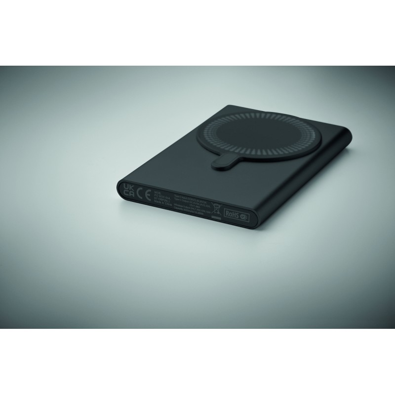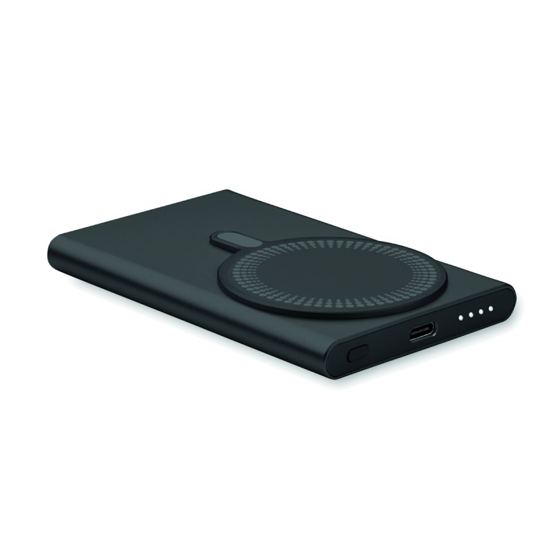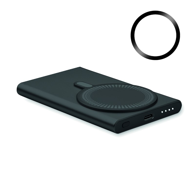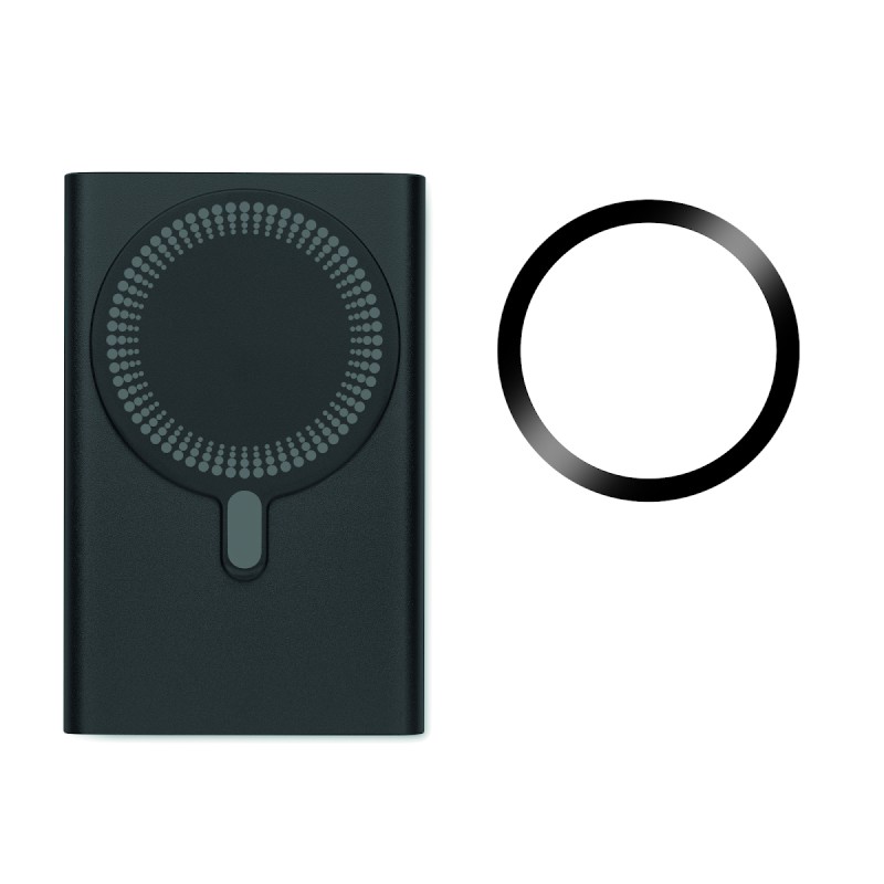 Chargeur magnétique sans fil (15W) en aluminium recyclé et power bank (5000 mAh). Sortie : DC 9V/1,66A. Prend en charge la technologie de charge rapide (20W). Entrée/sortie : Type-C. Prise en charge de la technologie Power Delivery (PD) pour charger le dernier MacPro®.