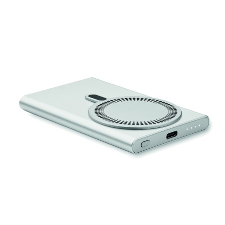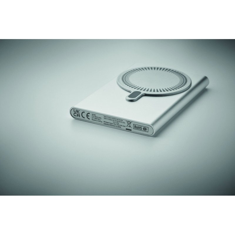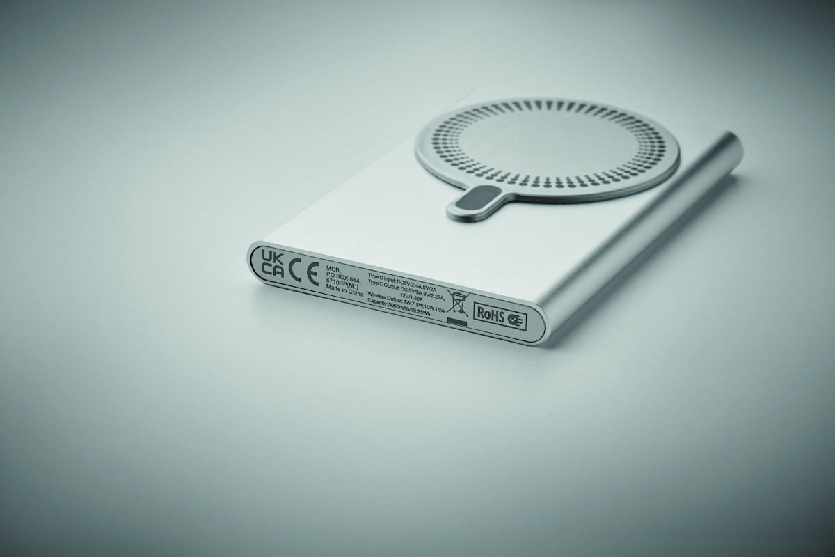 Chargeur magnétique sans fil (15W) en aluminium recyclé et power bank (5000 mAh). Sortie : DC 9V/1,66A. Prend en charge la technologie de charge rapide (20W). Entrée/sortie : Type-C. Prise en charge de la technologie Power Delivery (PD) pour charger le dernier MacPro®.