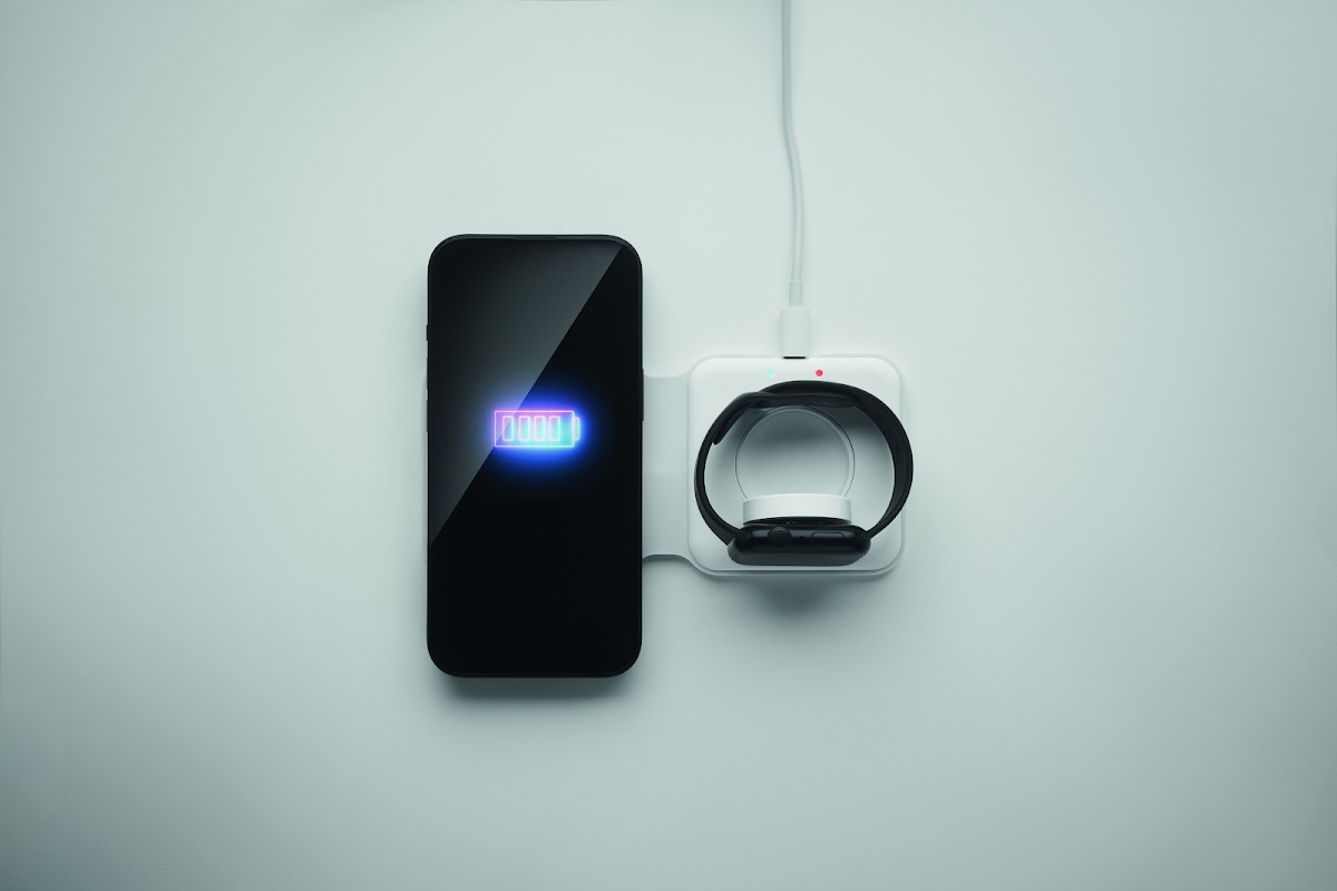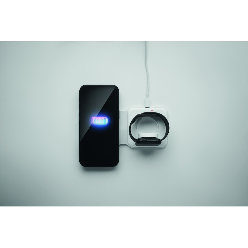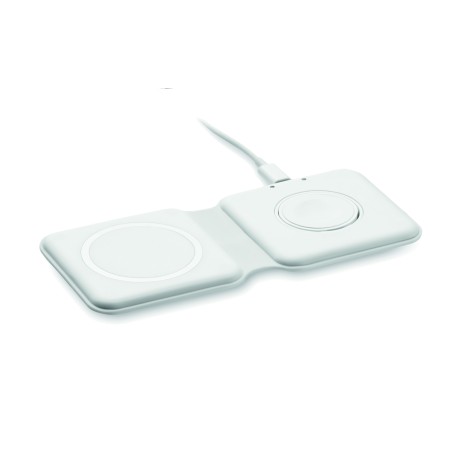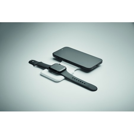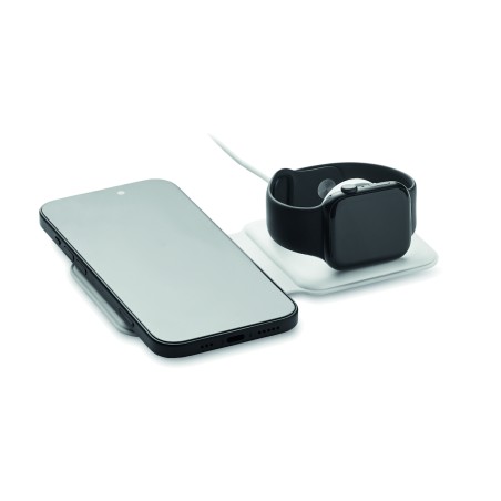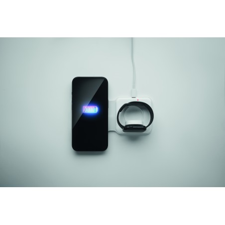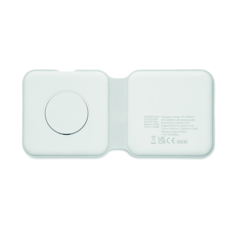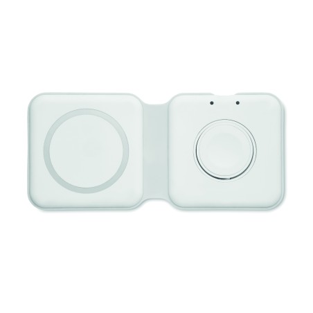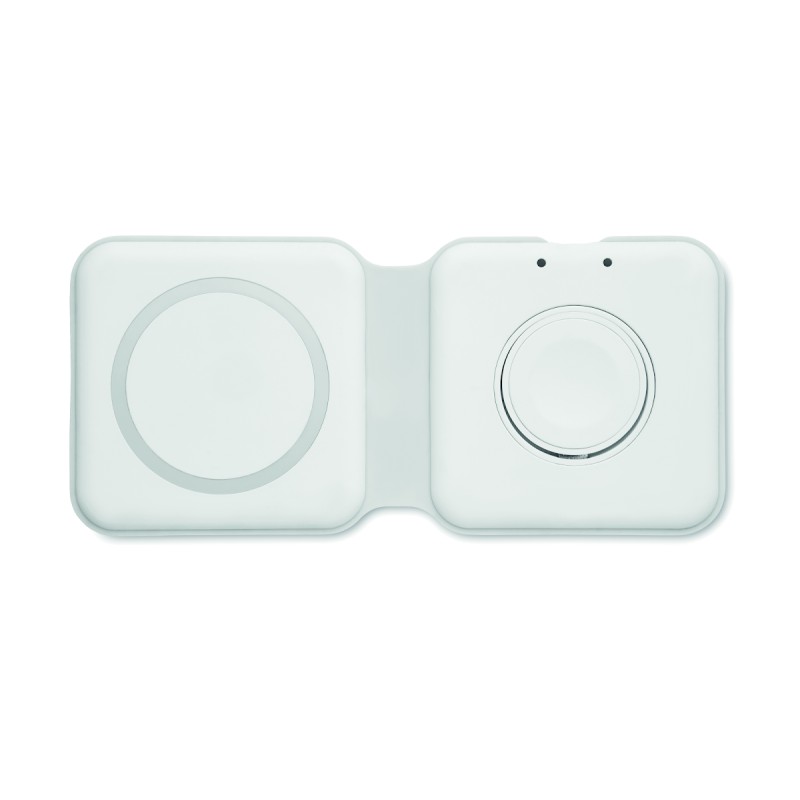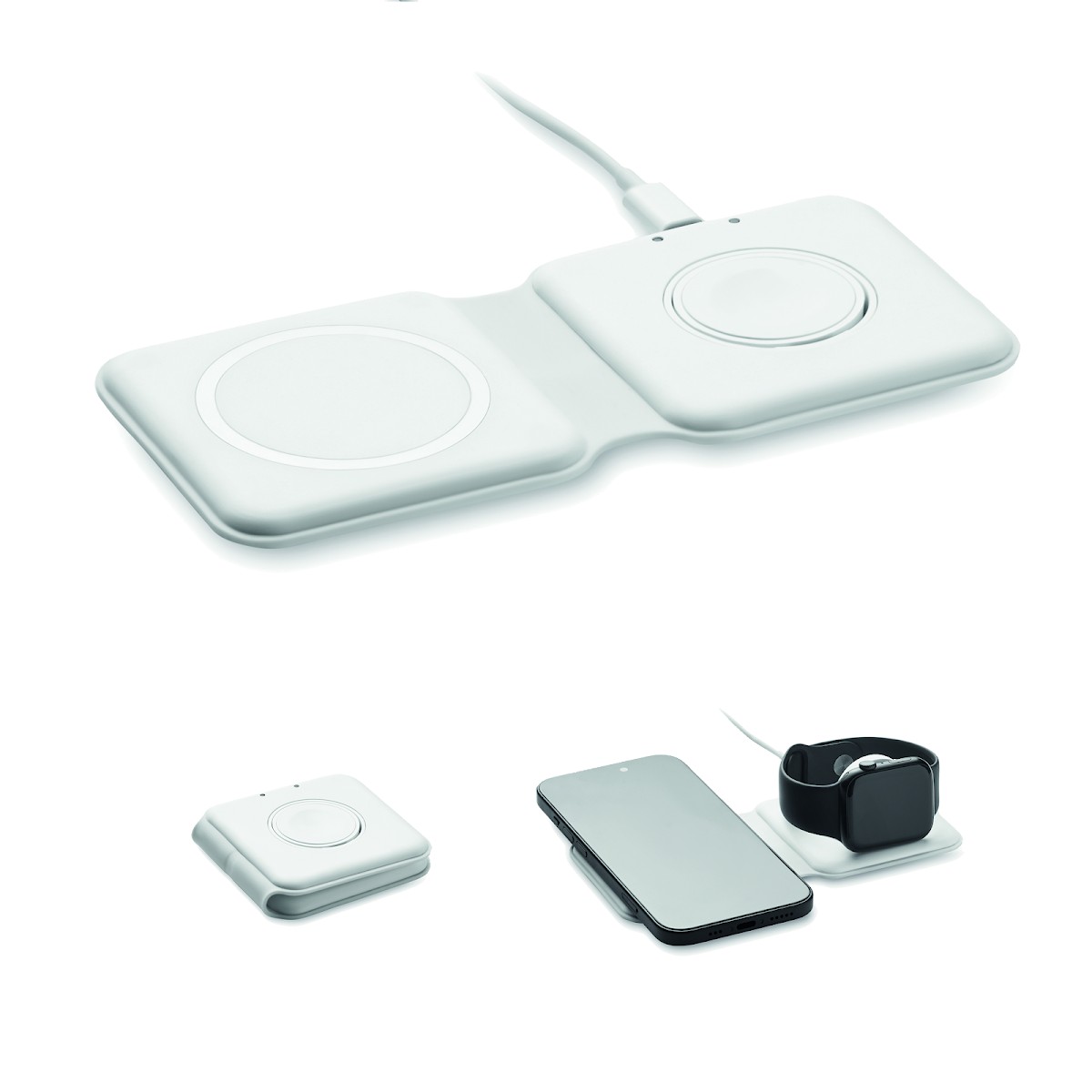Station de charge pliable 2 en 1 en ABS. Elle comprend un chargeur sans fil 15W et un chargeur pour smartwatch (Apple® uniquement).