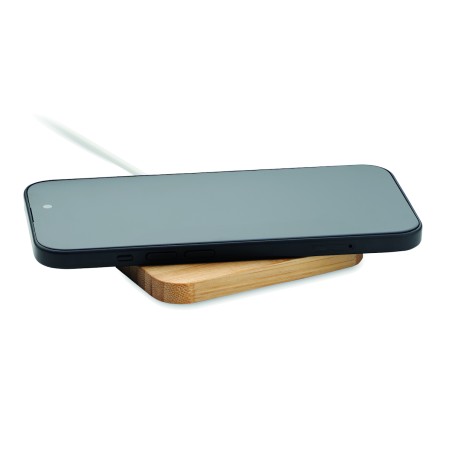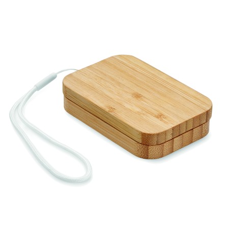 chargeur sans fil 15W avec câble de charge 3-en-1 avec connecteurs assortis. Présenté dans une boîte en bambou à fermeture magnétique avec sangle. Câble Type-C vers Type C, C vers USB-A, C vers micro-B, connecteurs C.
