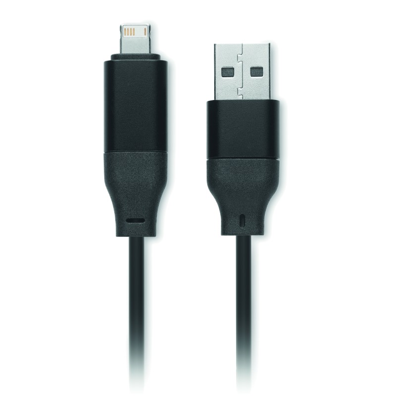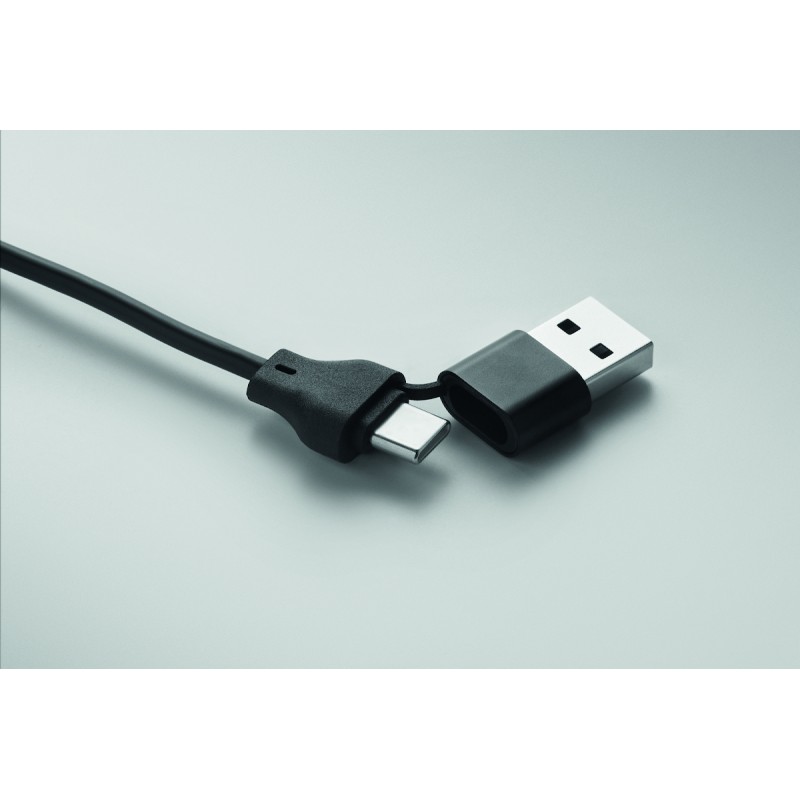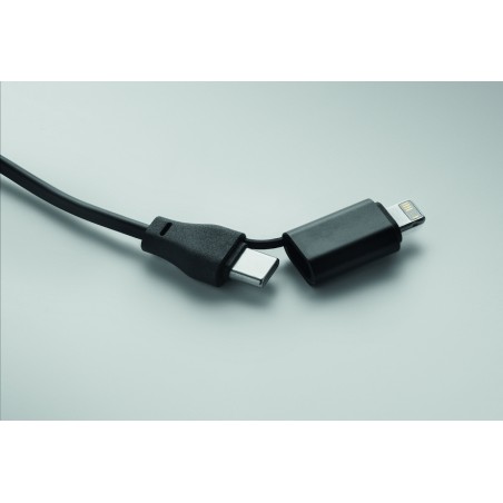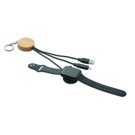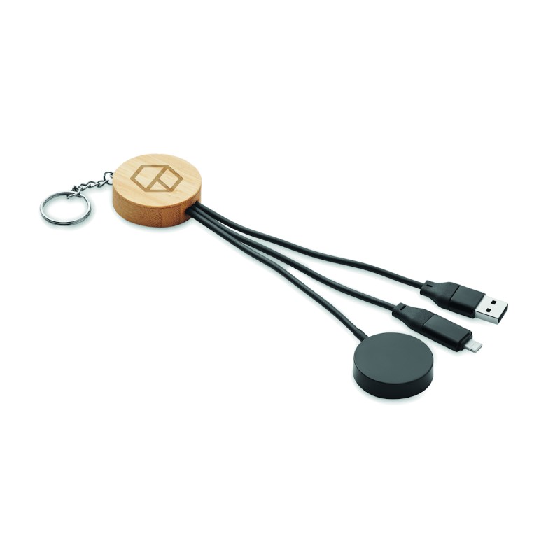 Porte-clés et câbles de charge 4 en 1 60W avec détails en bambou. Entrée : 2-en-1 Type-C (>&)> Type-A. Sortie : Chargement des montres (Samsung® et Apple®), type-C et micro-B (2 en 1).