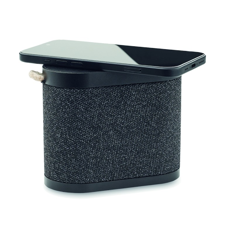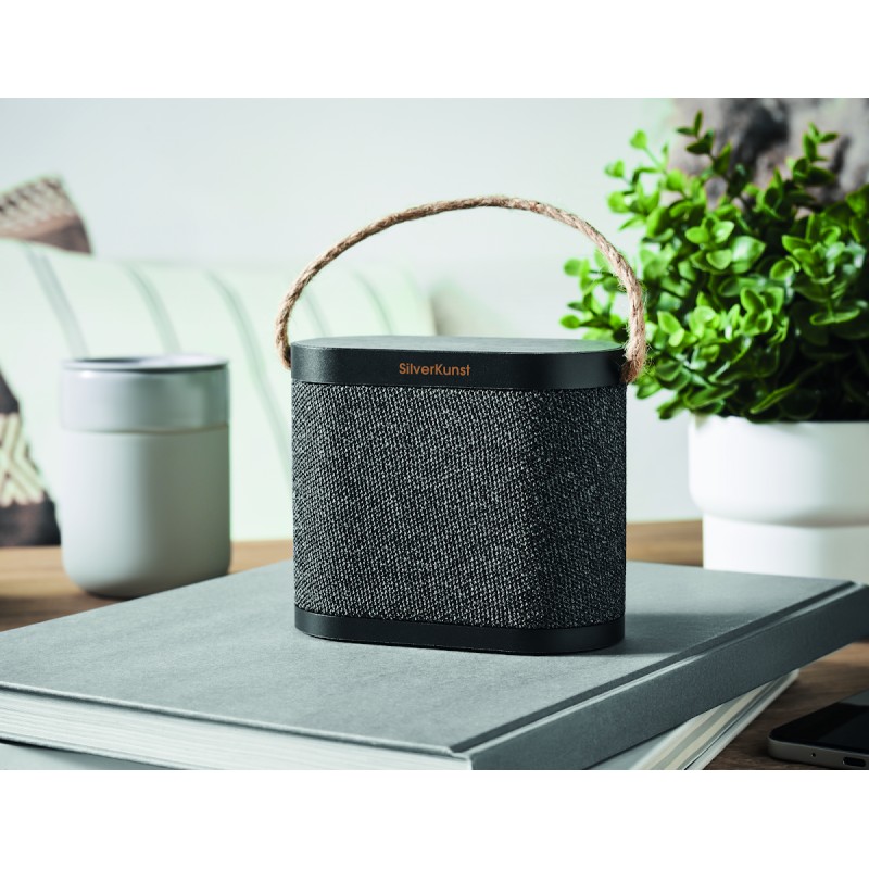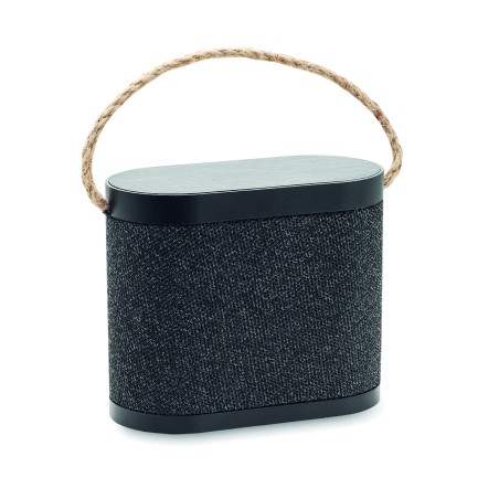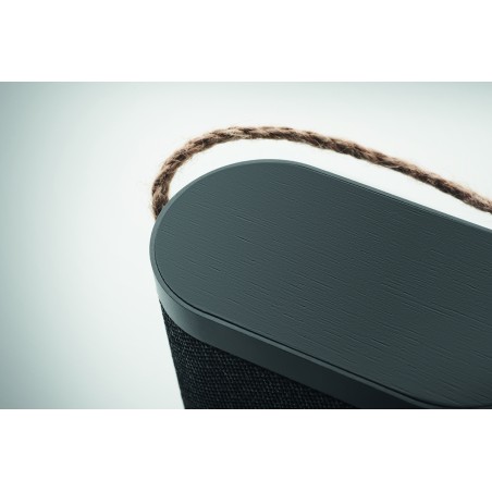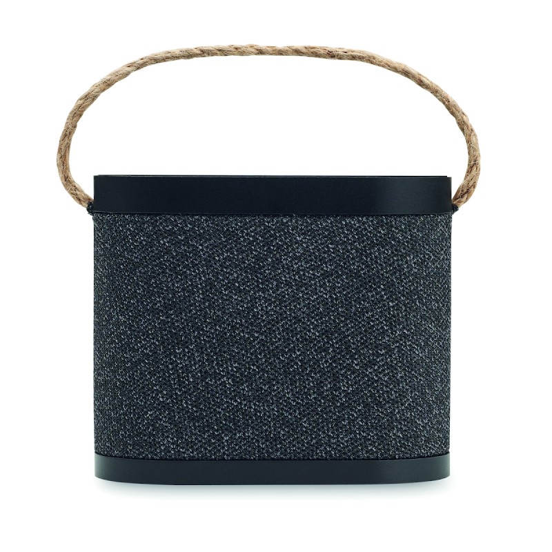 Enceinte sans fil 5.3 en ABS avec finition en tissu polyester RPET et chargeur sans fil 15 W en bambou, avec poignée en jute. 1 batterie rechargeable Li-Ion 1200 mAh. Données de sortie : 5 W, 4 Ohm et 5 V. Durée de lecture environ 4 h.