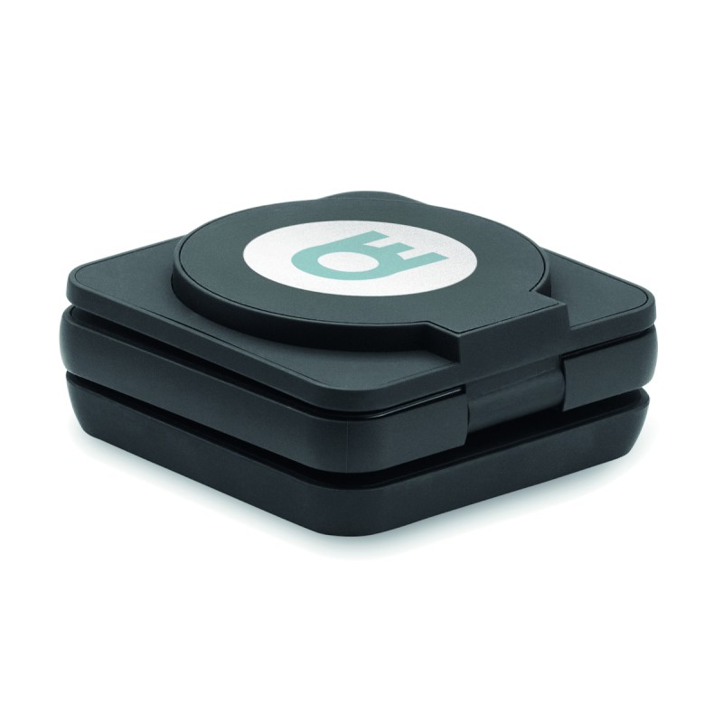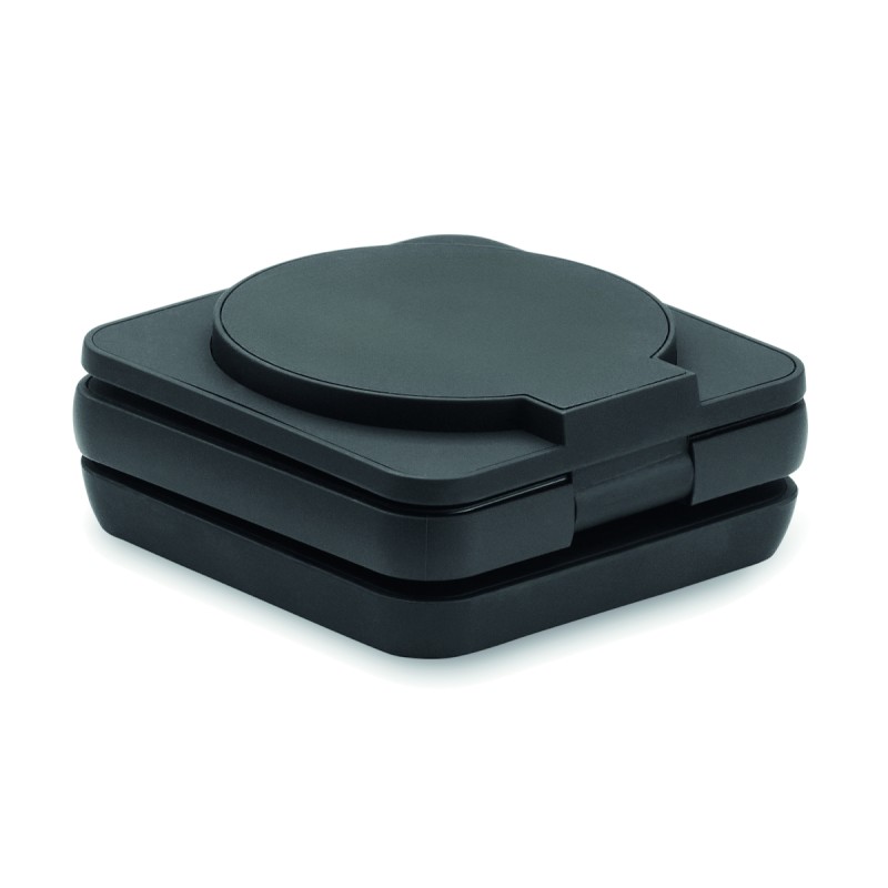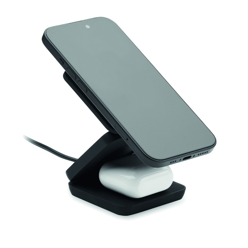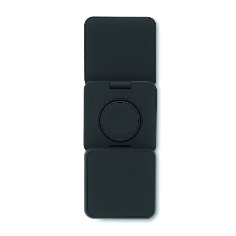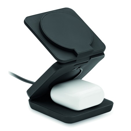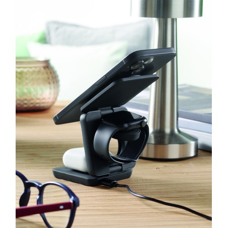 Station de charge pliable 3 en 1 en ABS recyclé caoutchouté. Elle comprend un chargeur magnétique sans fil 15W, un chargeur pour smartwatch (Apple® uniquement) et un chargeur TWS.