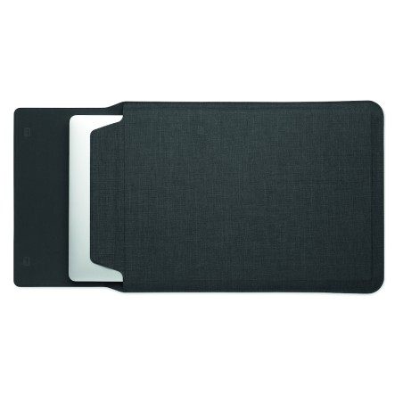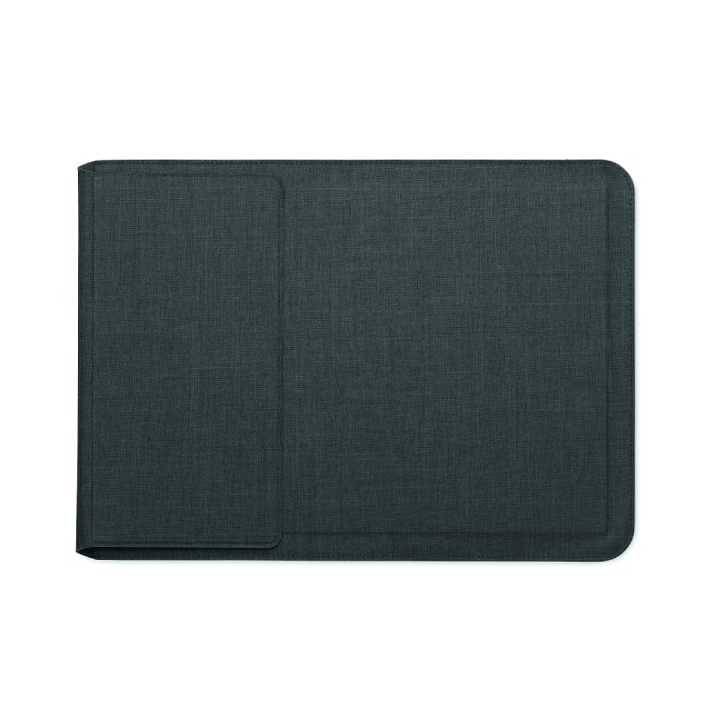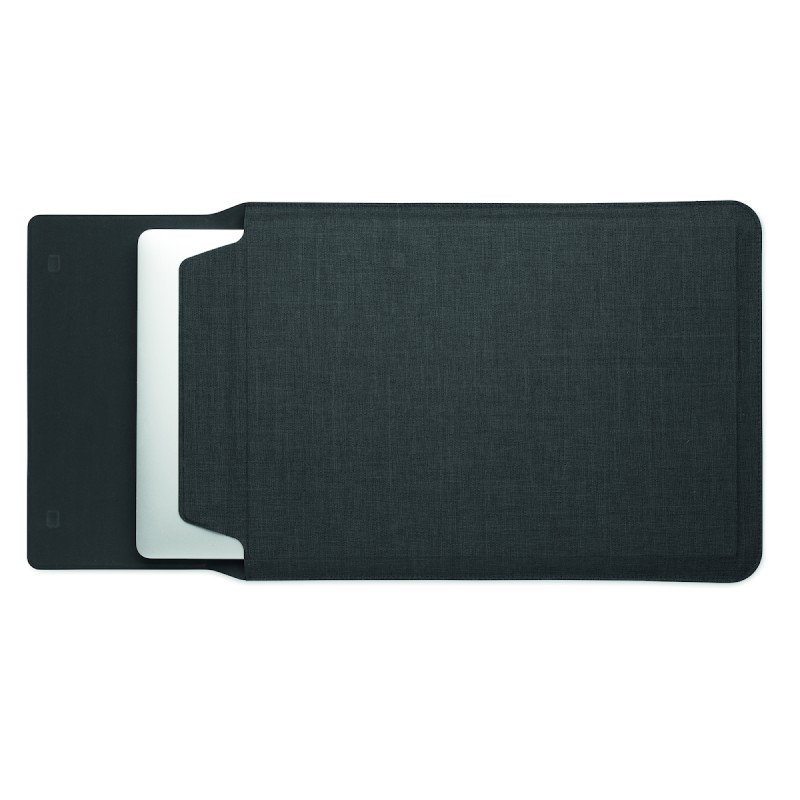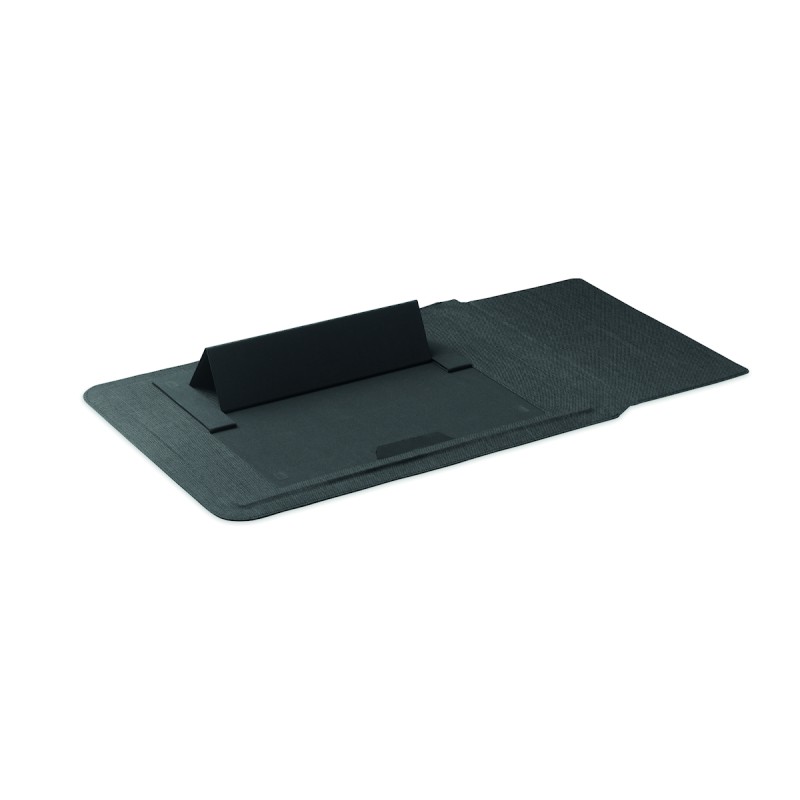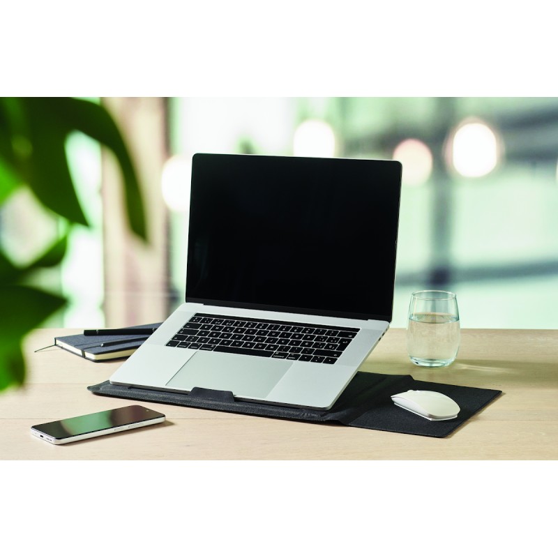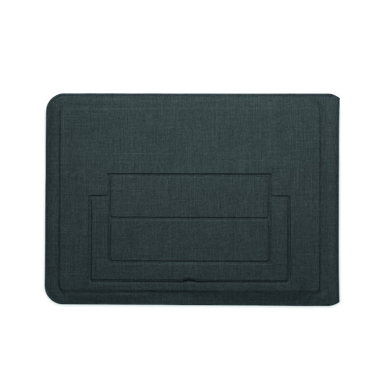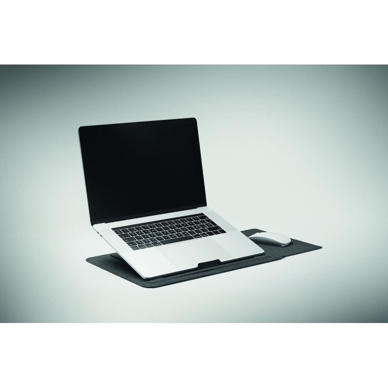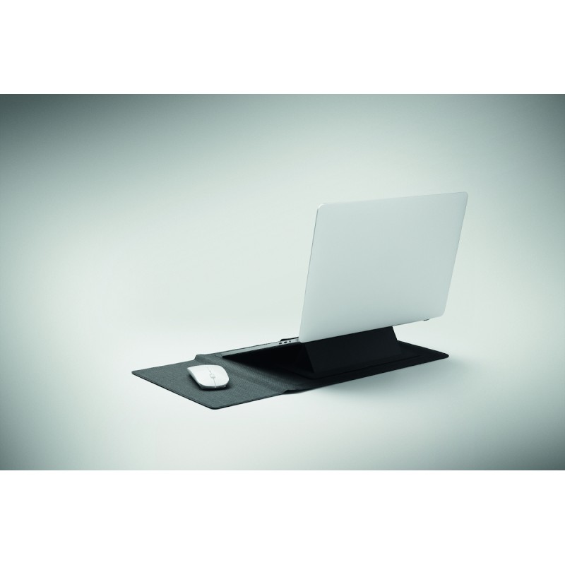 Pochette pour ordinateur portable RPET de 16 pouces avec support pour ordinateur portable et fonctionnalité de tapis de souris lorsqu'elle est dépliée.