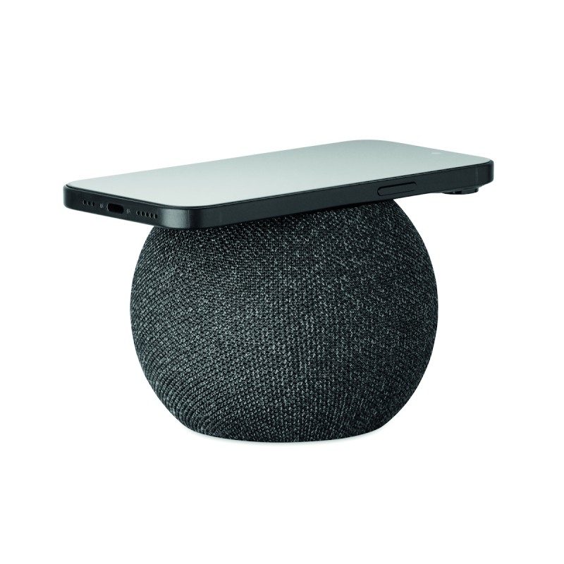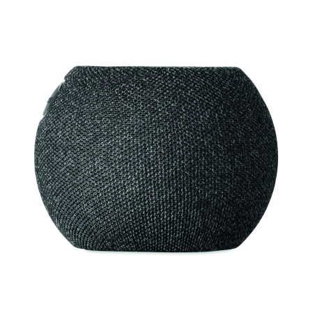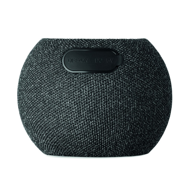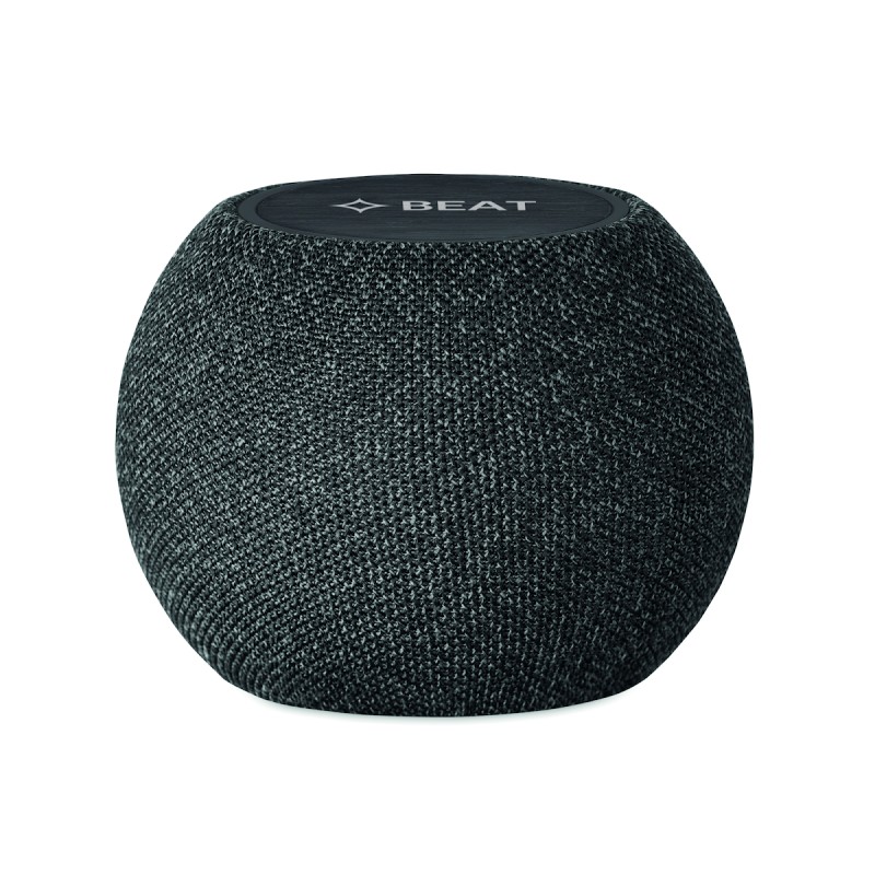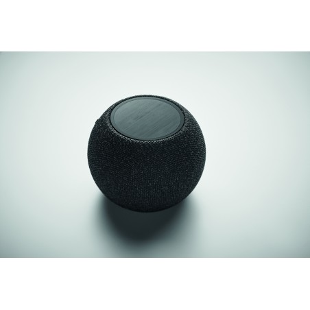 Haut-parleur 5.0 sans fil 0 et charge sans fil 15W en ABS et tissu RPET avec détails en bambou noir. 1 Batterie rechargeable Li-ION 1200 mAh incluse. Comprend un port pour carte SD et un câble AUX/USB. Données de sortie : 3W, 3 Ohm et 5V. Durée de lecture : environ 5 heures.