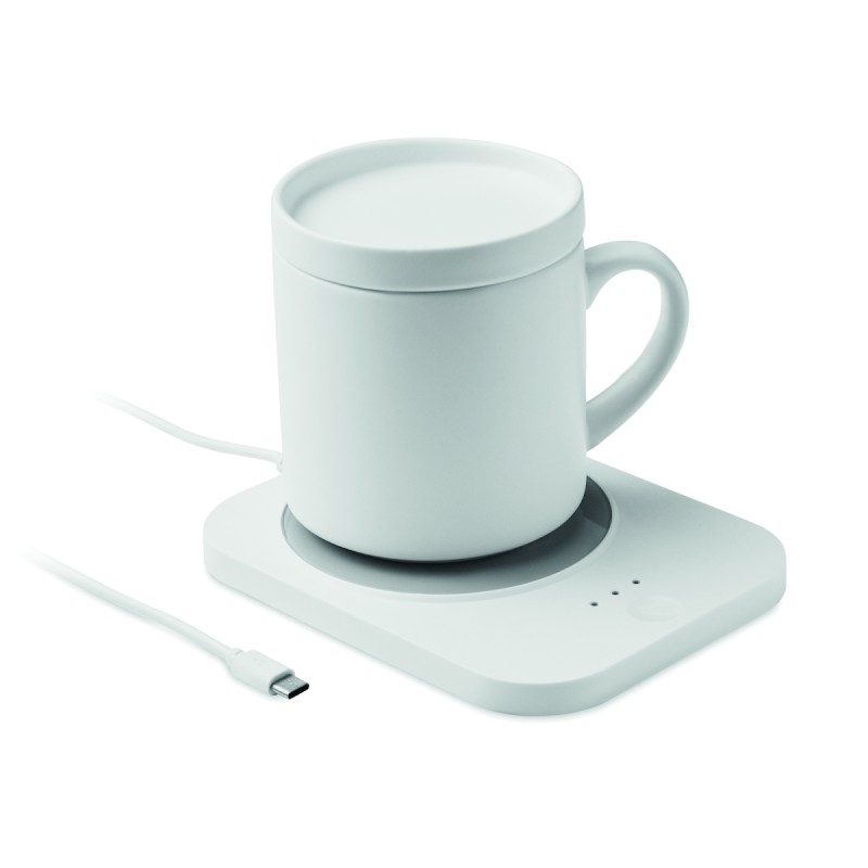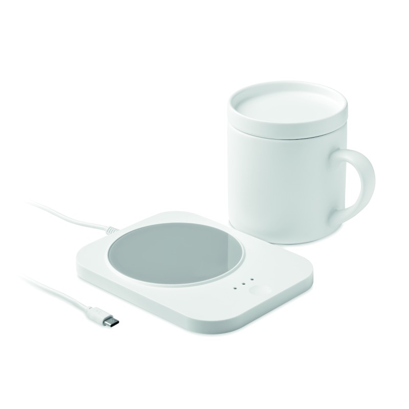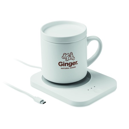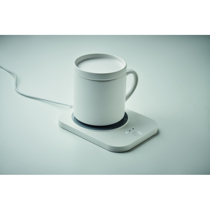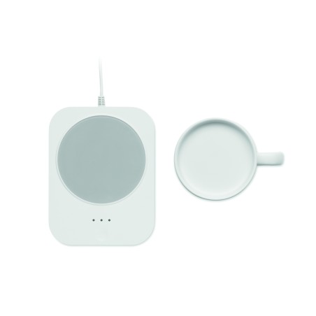 Chargeur sans fil 2 en 1 15W et chauffe-tasse en ABS, mug en céramique inclus. Garde les boissons chaudes jusqu'à un maximum de 50ºC. 3 réglages de température sur panneau tactile. Câble USB. Sortie : DC 9V/1.67A (15W). Capacité 250ml.