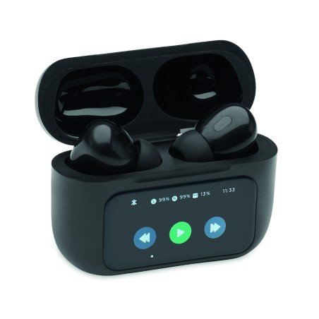 Oreillettes stéréo sans fil True Wireless Stereo (TWS) 5.0 en ABS (30 mAh) avec ANC/ENC et microphone et base de chargement 230 mAh. Commande sur écran tactile.
