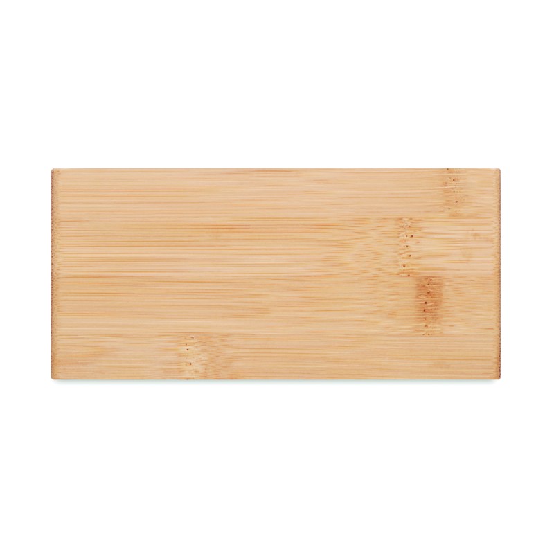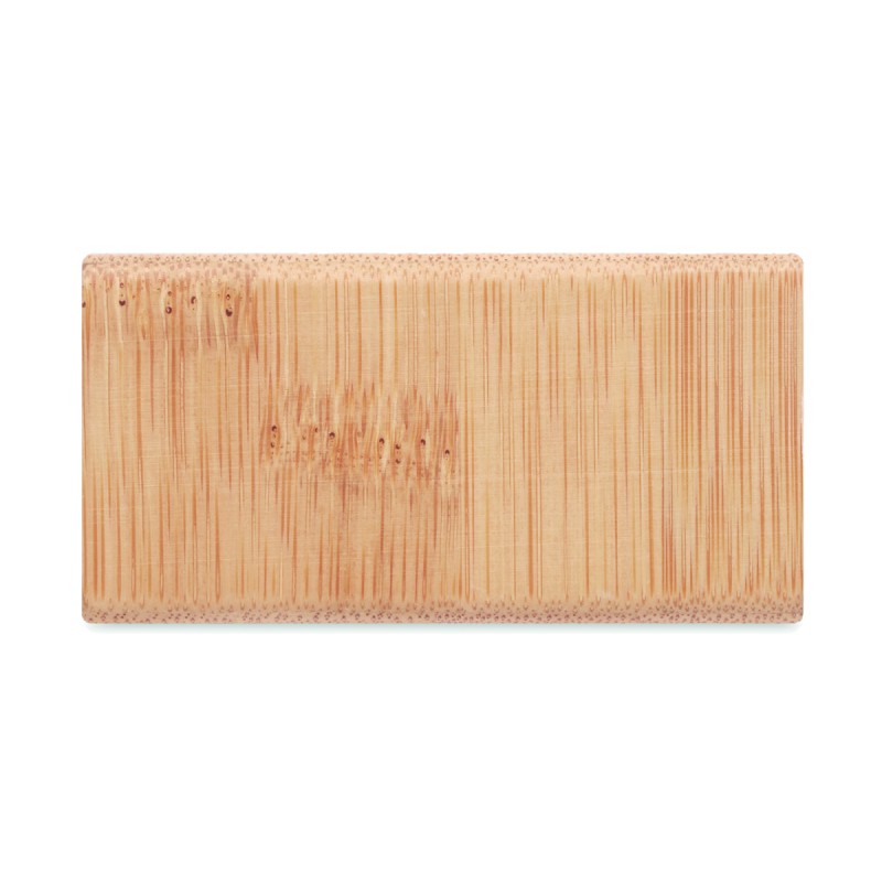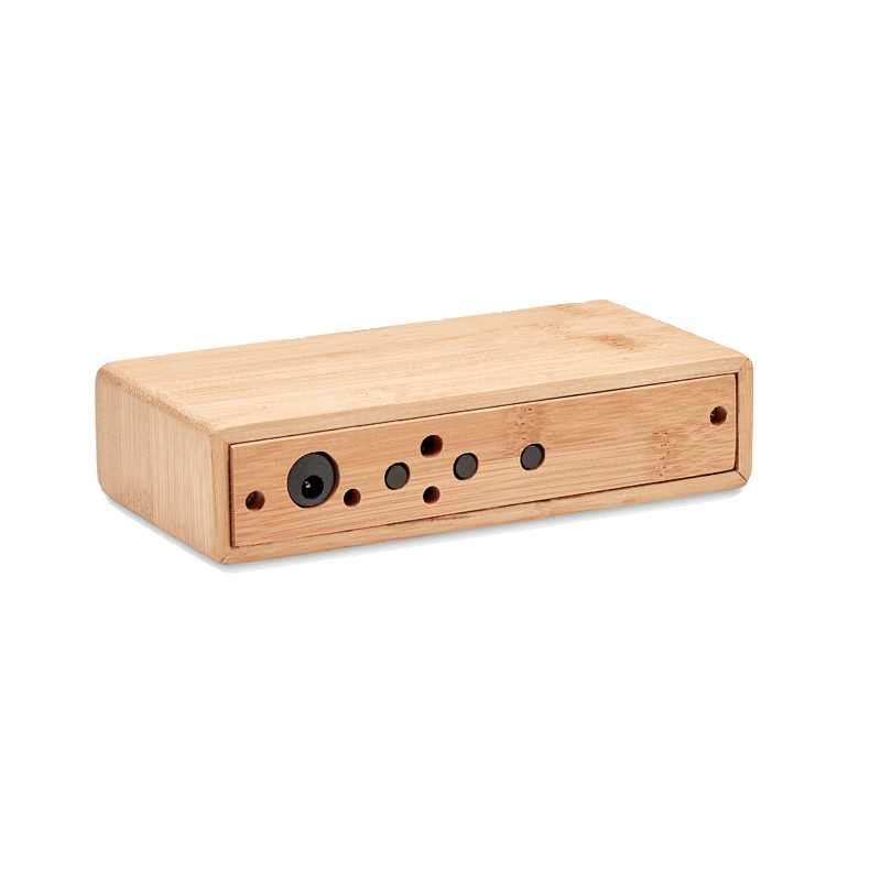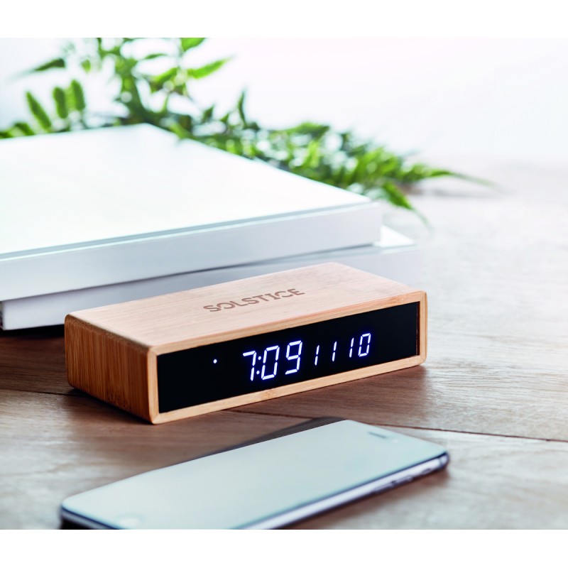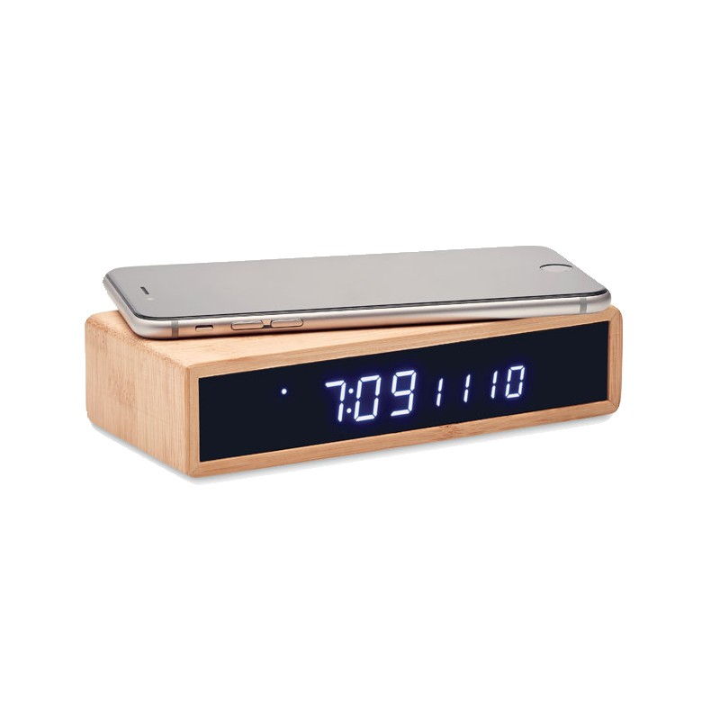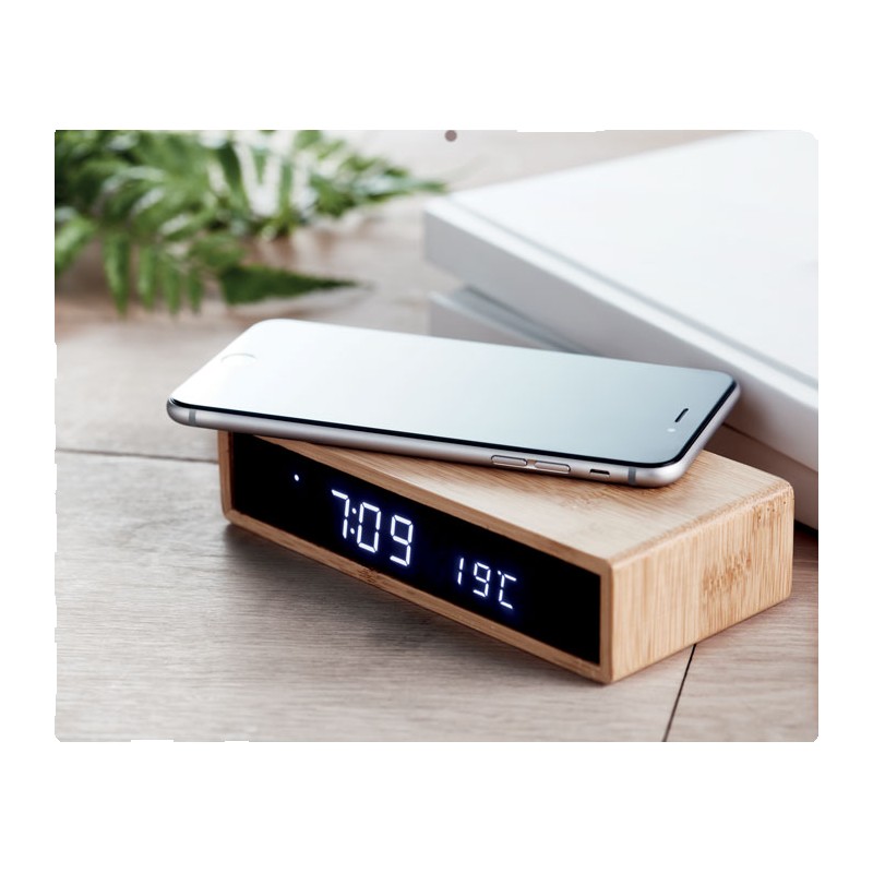 Chargeur sans fil en bambou incluant un réveil avec affichage par LED bleue et température. Adaptateur AC-DC. Sortie sans fil : DC5V/1A (5W). Le bambou est un produit naturel, et présente de légères variations de couleur, de décoration et de tailles