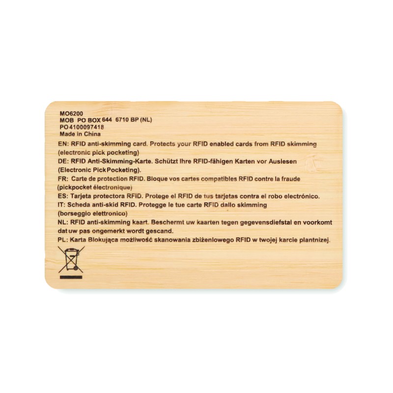Carte RFID anti-écrémage en bambou. Grâce au champ électromagnétique, elle sécurise toutes les cartes 13,56 MHz contre le vol à la tire électronique sur une distance de 2 à 3 cm autour de la carte. (1,3 mm). Le bambou est un produit naturel, et présente de légères variations de couleur, de décoration et de tailles.