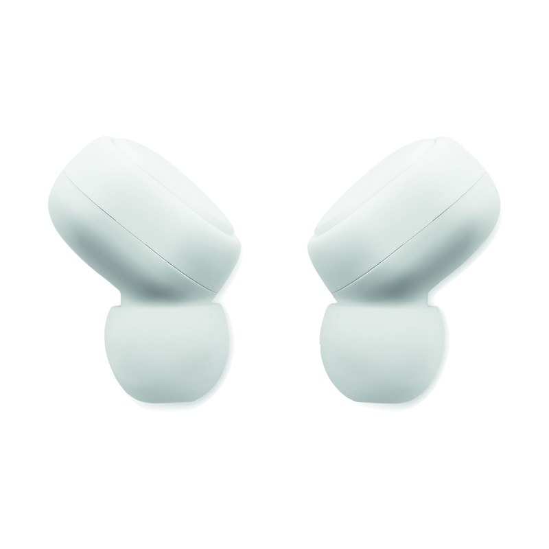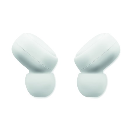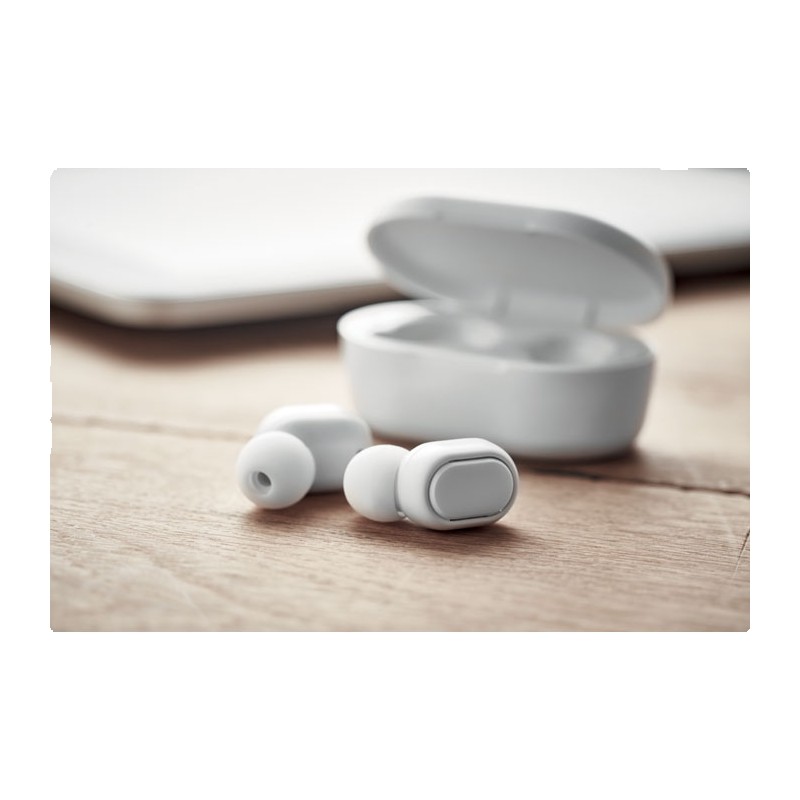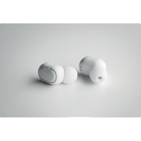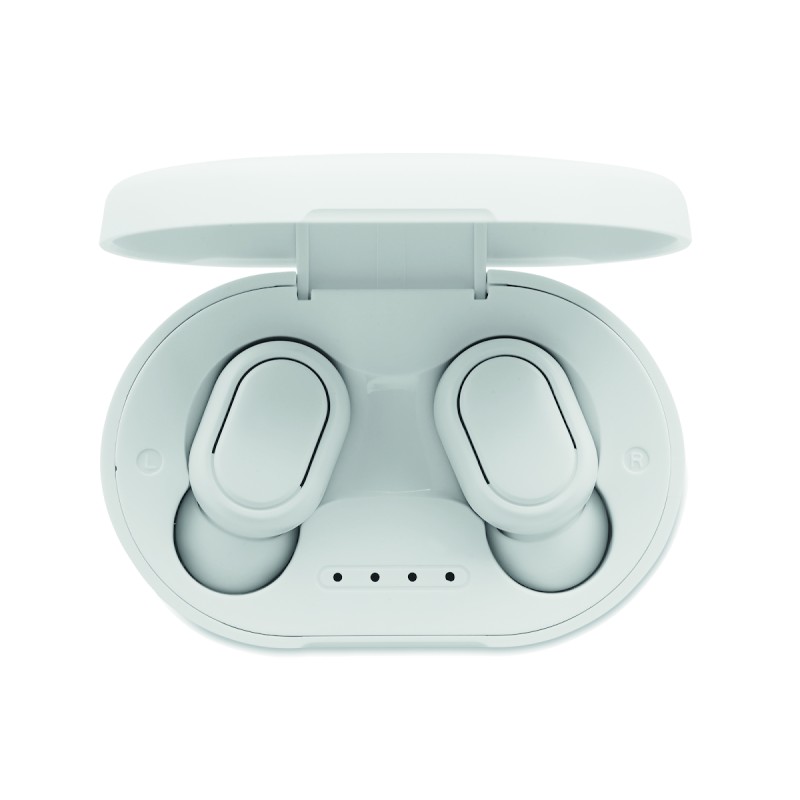Oreillettes stéréo sans fil (TWS) 5.3 en ABS recyclé avec microphone et batterie 40 mAh intégrée. Durée d'écoute d'environ 4 heures. Appairage automatique. Câble de charge micro USB et station de charge 300 mAh inclus.