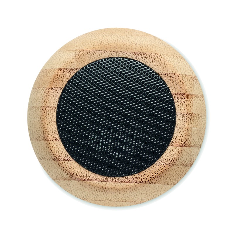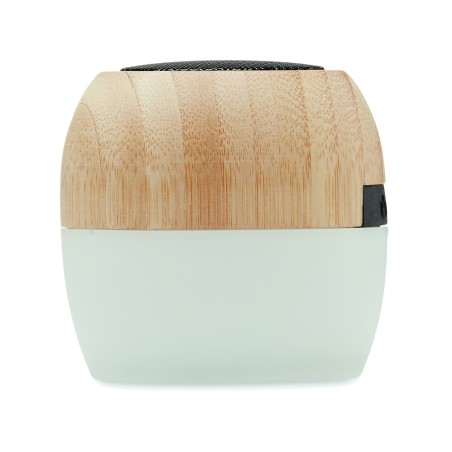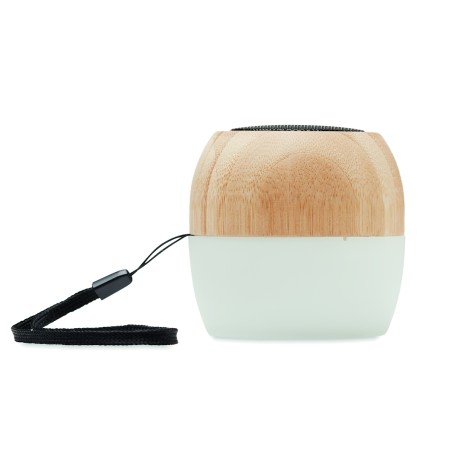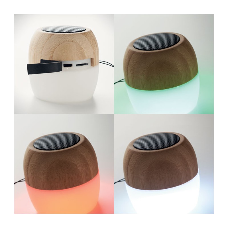 Haut-parleur sans fil 5.0 en bambou et PP avec lumière d'ambiance à 4 couleurs et sangle de transport. 1 Batterie rechargeable Li-POL 300 mAh. Données de sortie : 3W, 4 Ohm. Durée d'écoute : environ 2h. Le bambou est un produit naturel, et présente de légères variations de couleur, de décoration et de tailles.