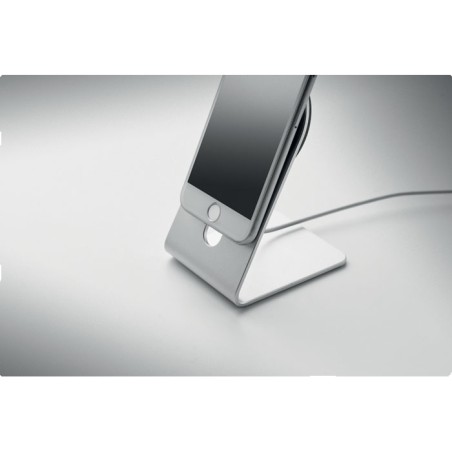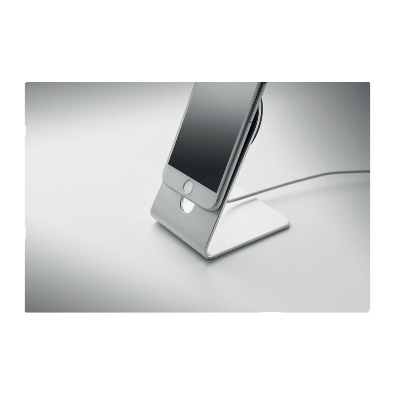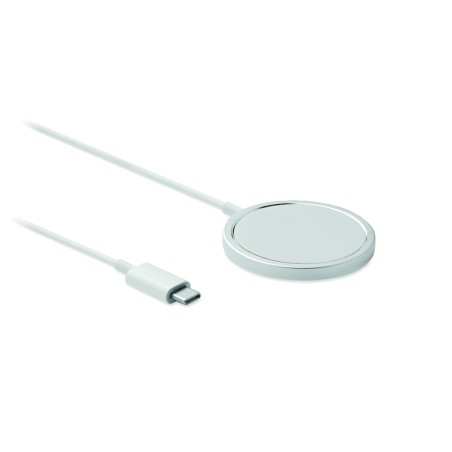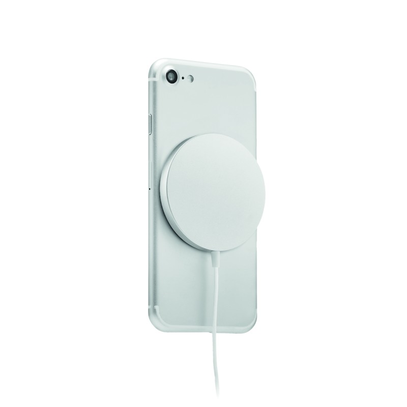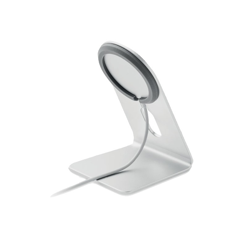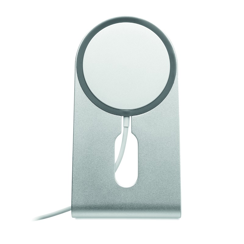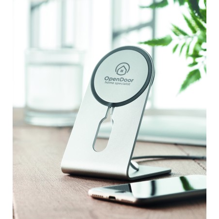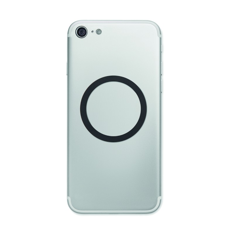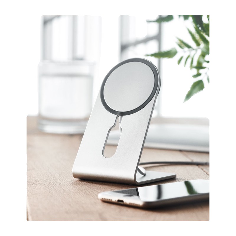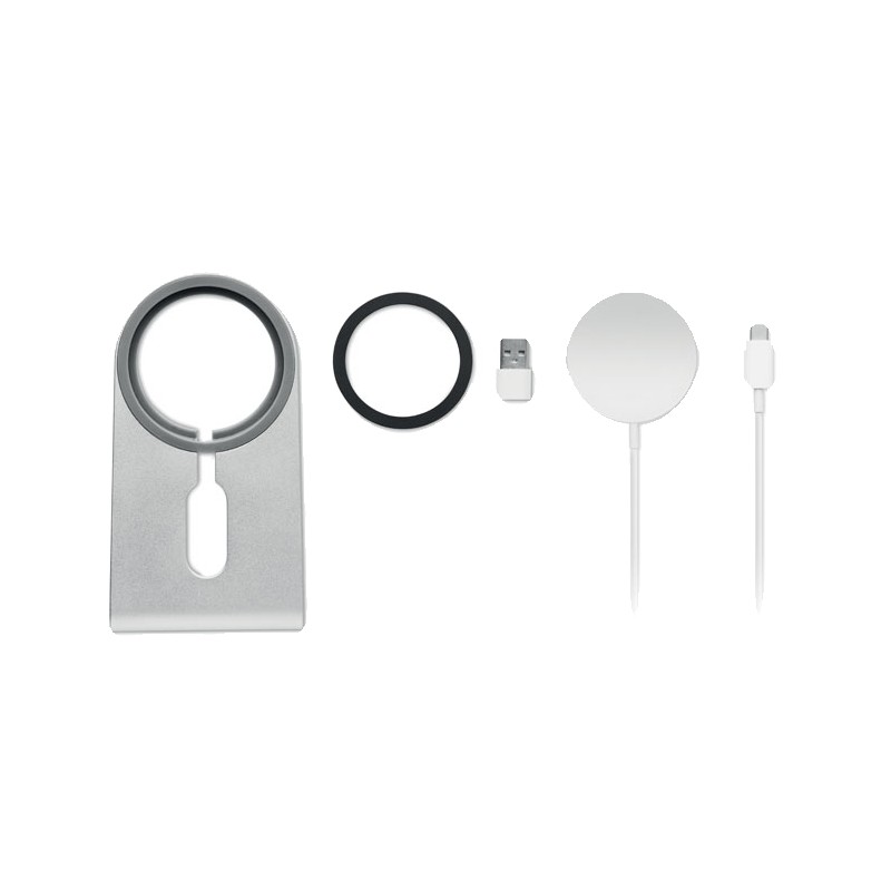 Chargeur sans fil magnétique portable en aluminium de 15W avec support pour téléphone. Comprend un anneau métallique magnétique supplémentaire . Sortie : 9V/1.67A (15W) pour une charge rapide.