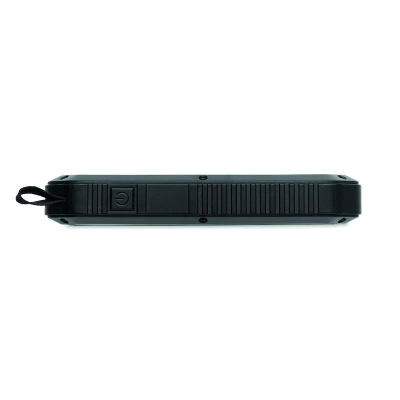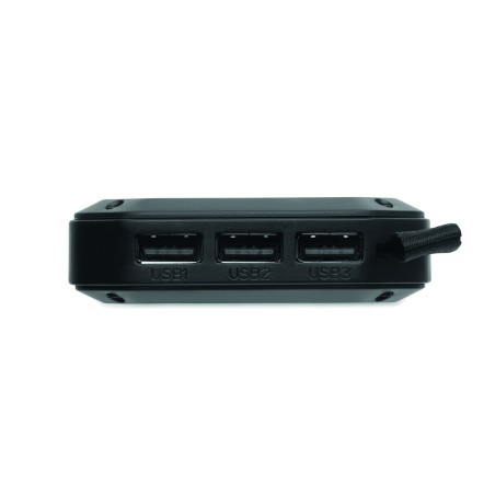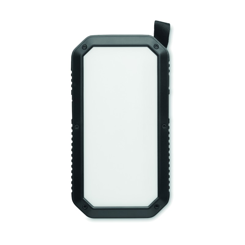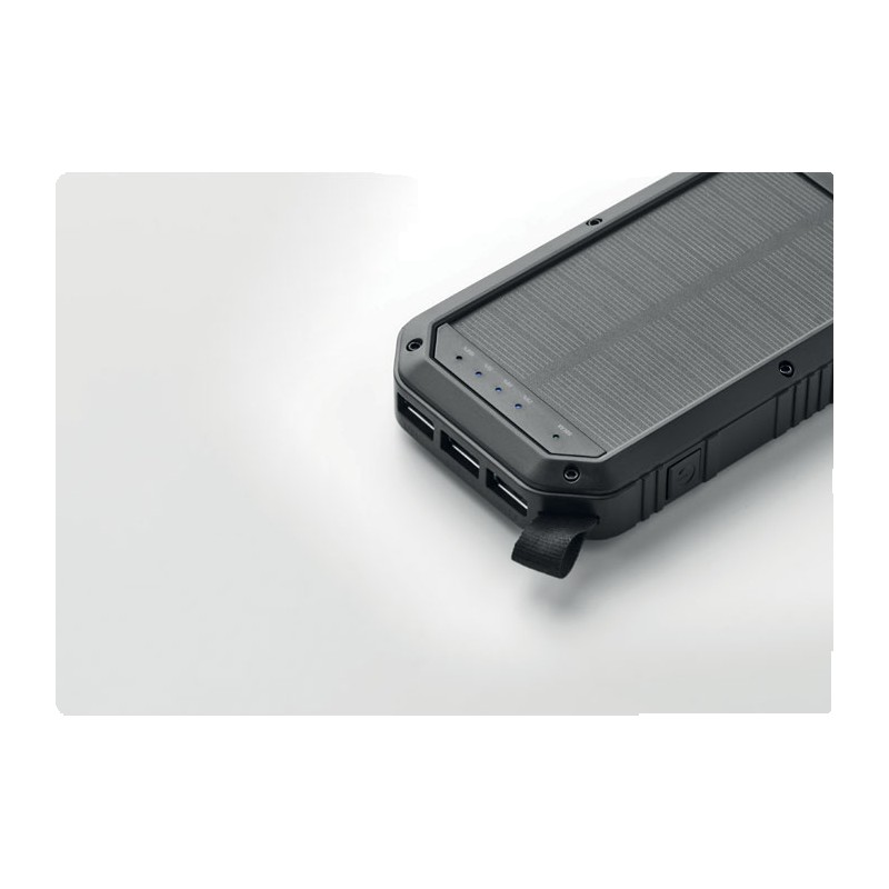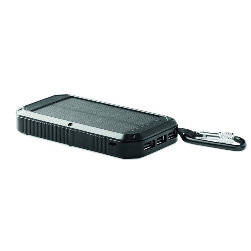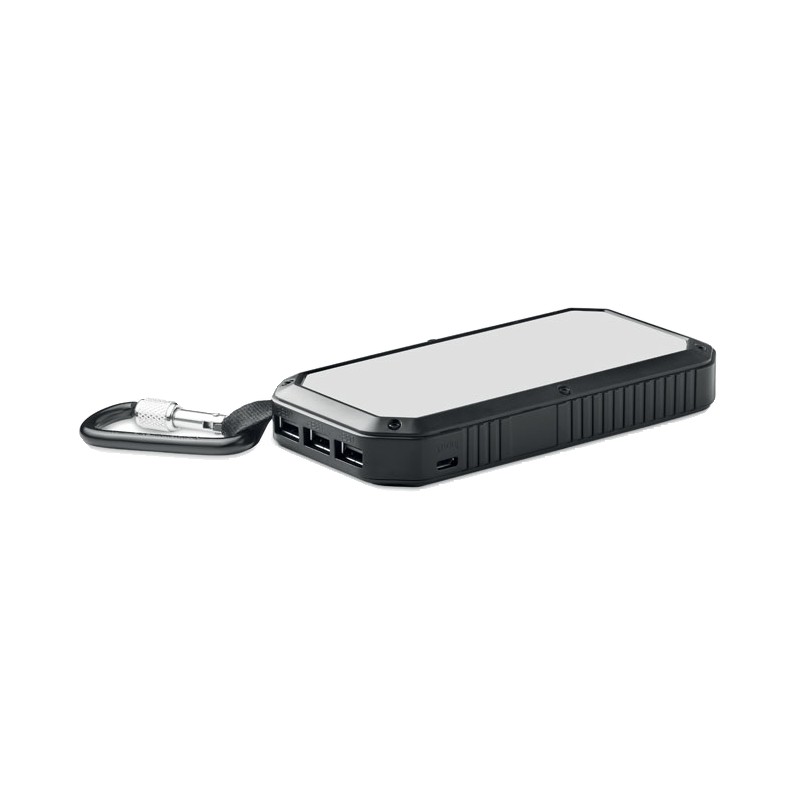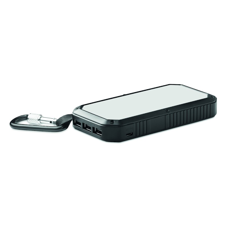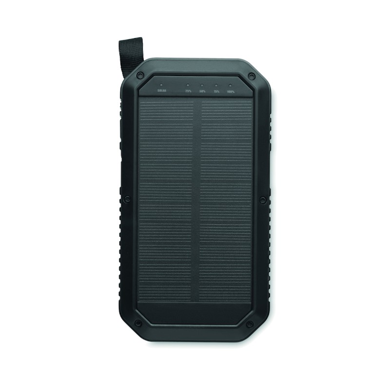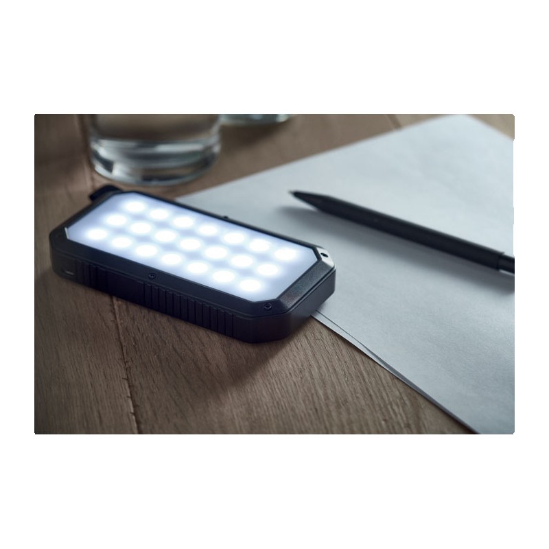Powerbank solaire 8000 mAh avec fonction d'éclairage. Comprend 21 lampes LED, un câble USB avec prise micro usb et un mousqueton. Courant de sortie DC5V/1A et DC5V/2A.