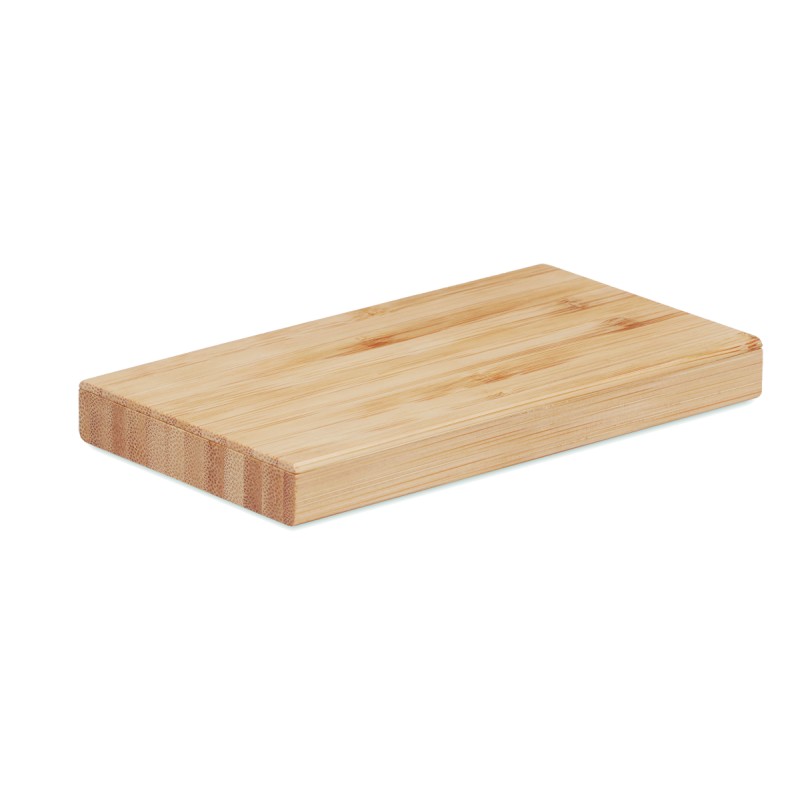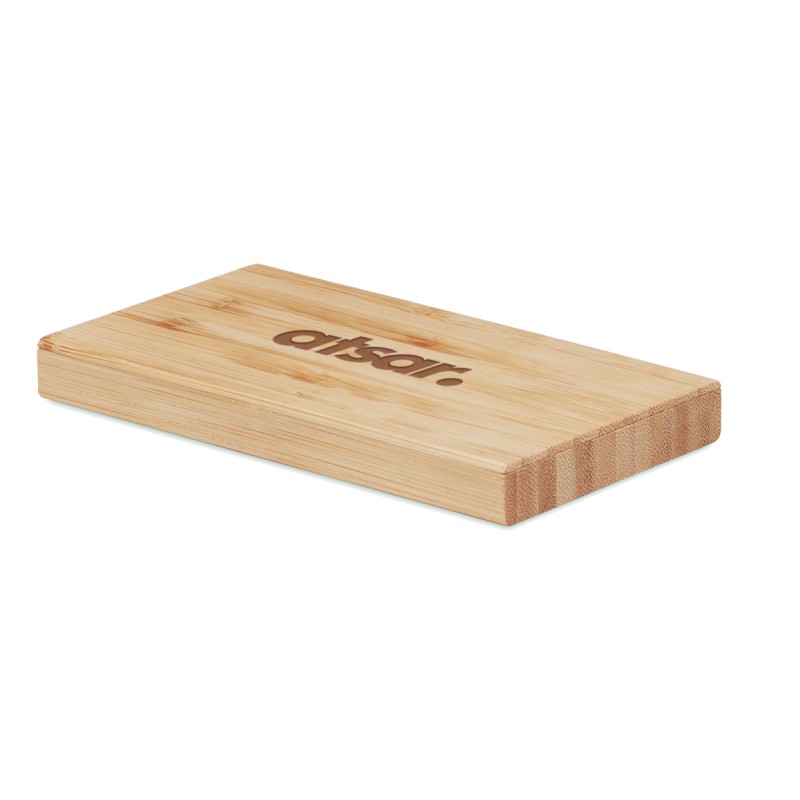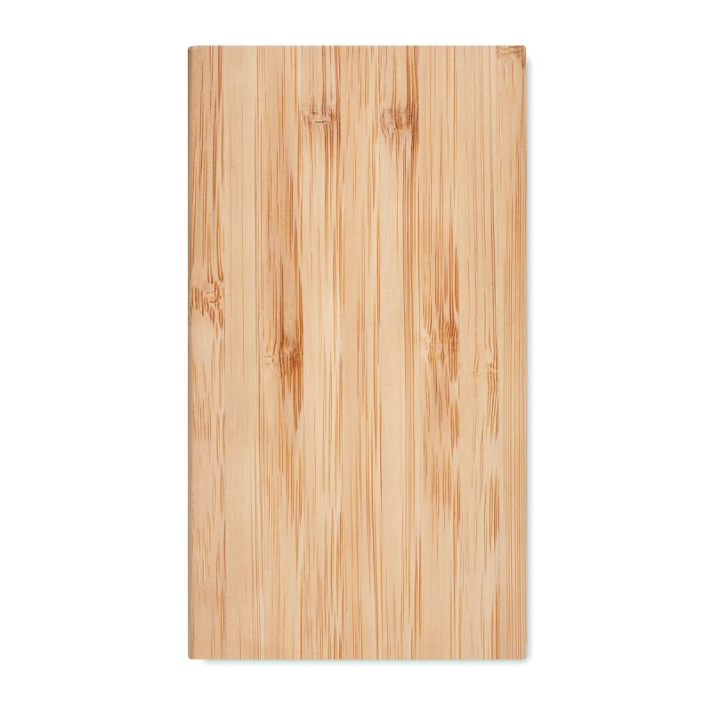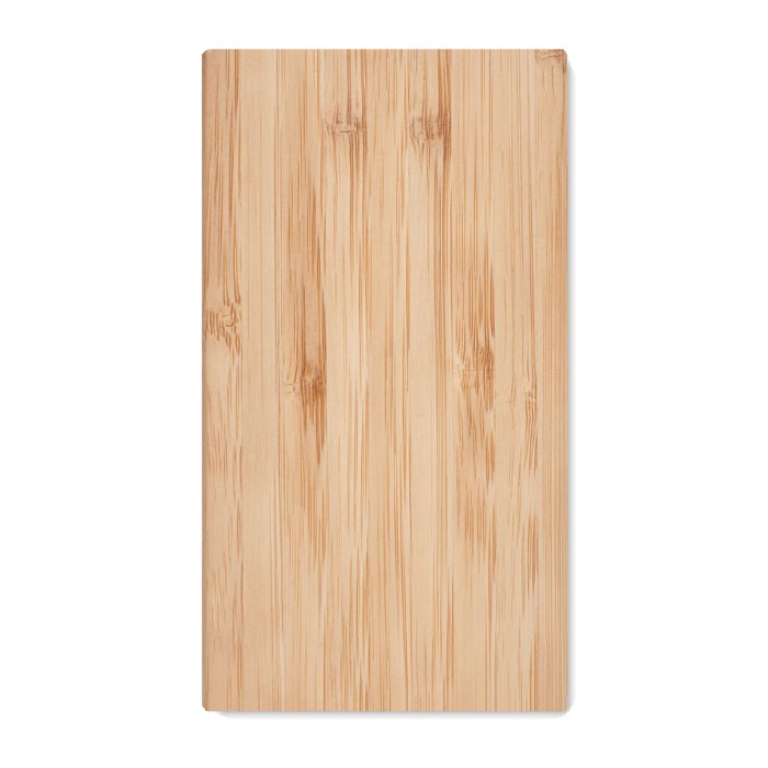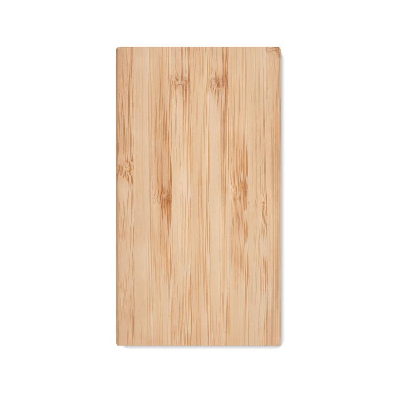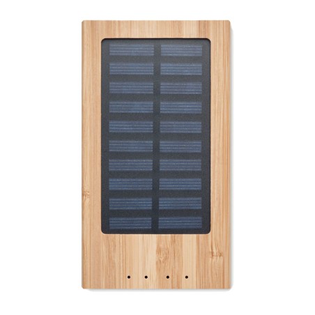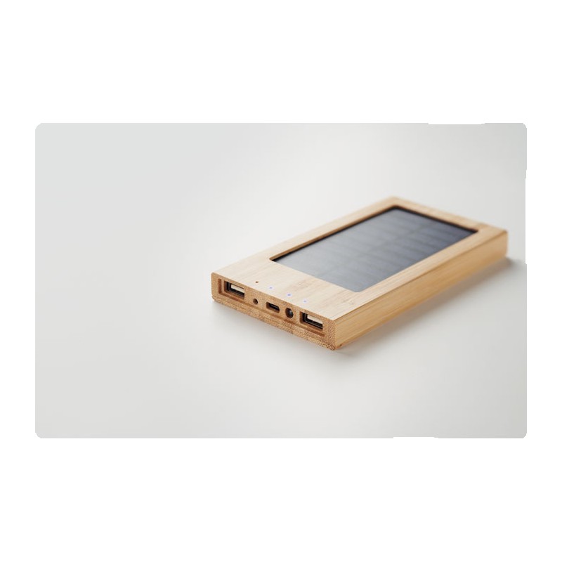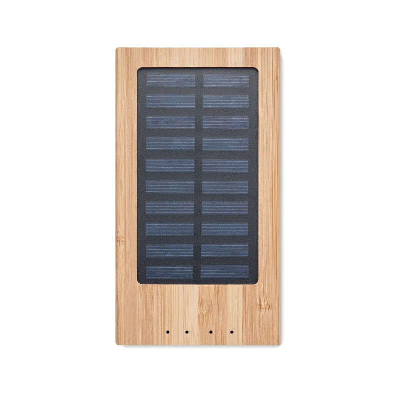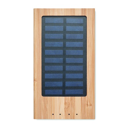 Power bank 4000 mAh en bambou et panneau solaire. Capacité pour l'utilisation d'un smartphone, 2 sorties USB DC5V/1A. Comprend un voyant lumineux et un câble USB avec prise micro usb. Le bambou est un produit naturel, et présente de légères variations de couleur, de décoration et de tailles.