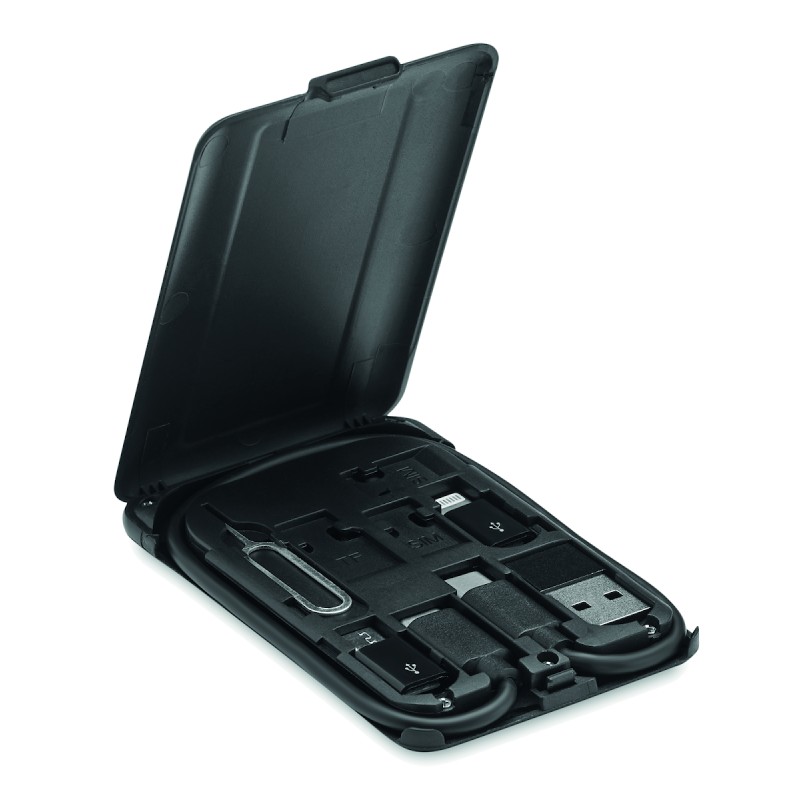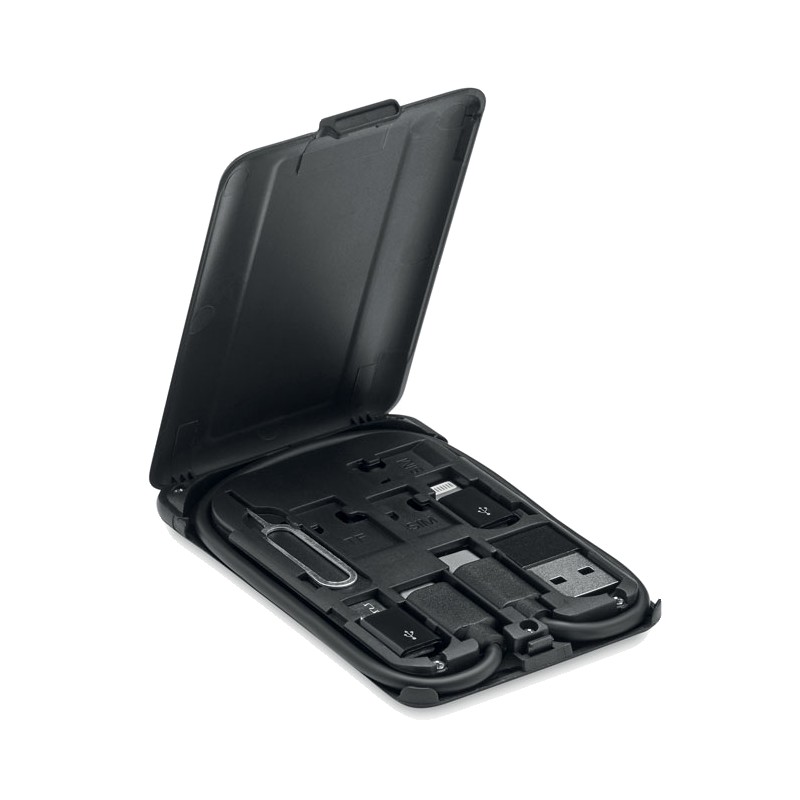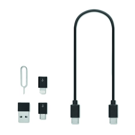 Câble de stockage compact avec chargeur sans fil 15W et support pour téléphone. Comprend : type C à C , convertisseurs vers micro B, C vers adaptateur secteur, éjecteur de carte SIM et espace pour 2 cartes Nano Sim et 1 carte TF.