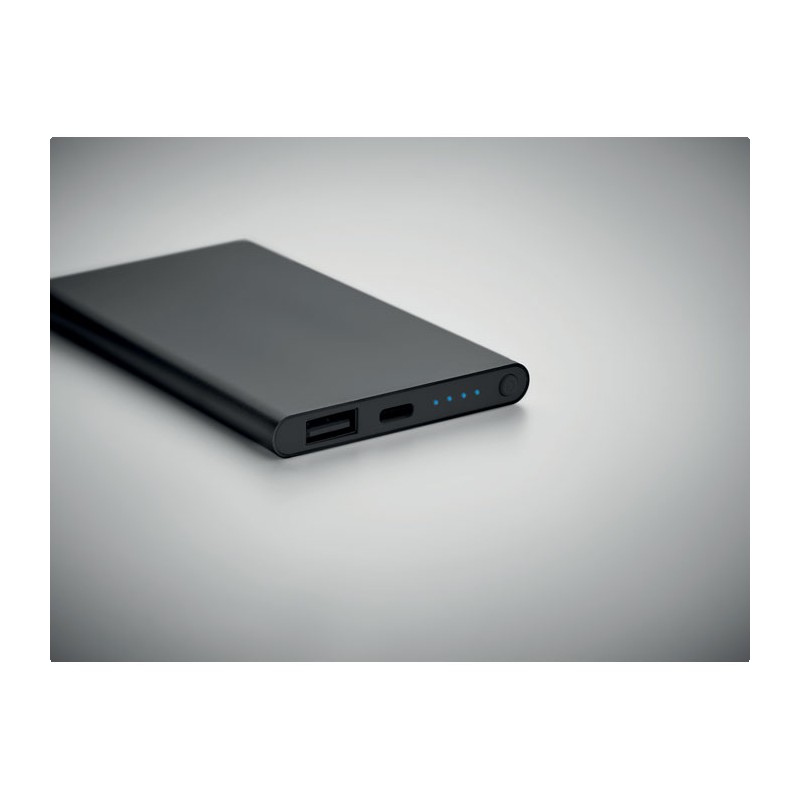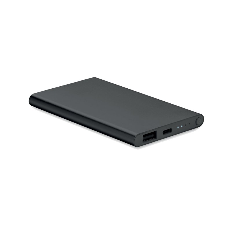 Powerbank d'une capacité de 4000 mAh en aluminium recyclé. Courant de sortie DC5V/2A.Comprend un voyant lumineux et un câble USB de type C. Entrée/sortie : Type C.