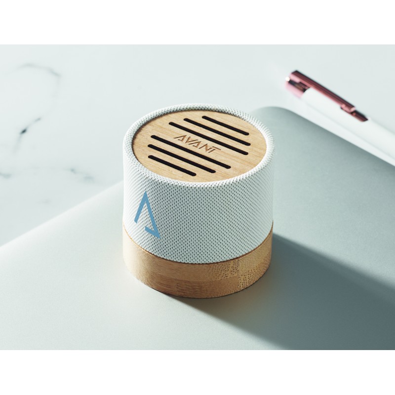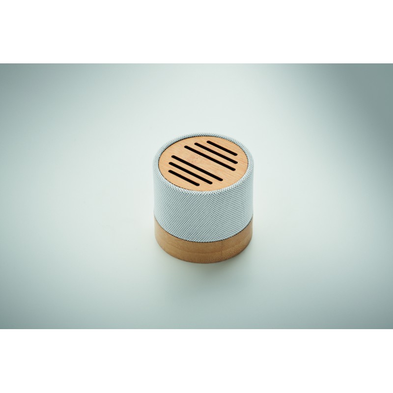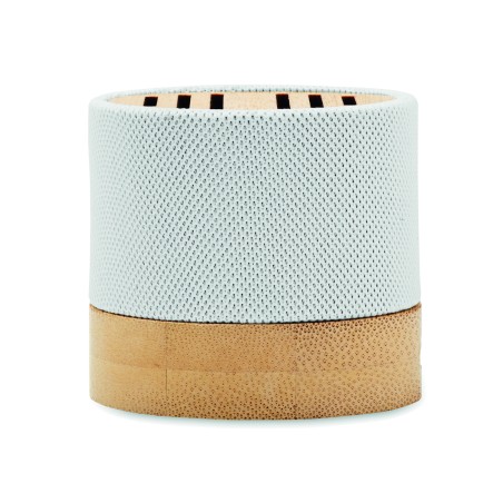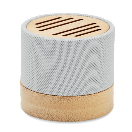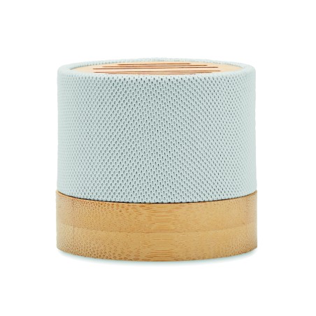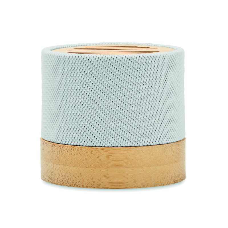 Haut-parleur sans fil 5.0 en RPET détail et bambou. Témoin LED. 1 Batterie rechargeable Li-ION 300 mAh incluse. Port pour carte SD et câble AUX/USB inclus. Données de sortie : 3W, 3 Ohm et 5V. Durée de lecture d'env. 3h. Le bambou est un produit naturel, et présente de légères variations de couleur, de décoration et de tailles.