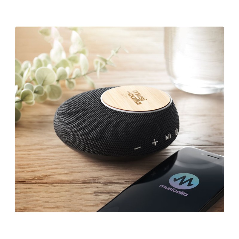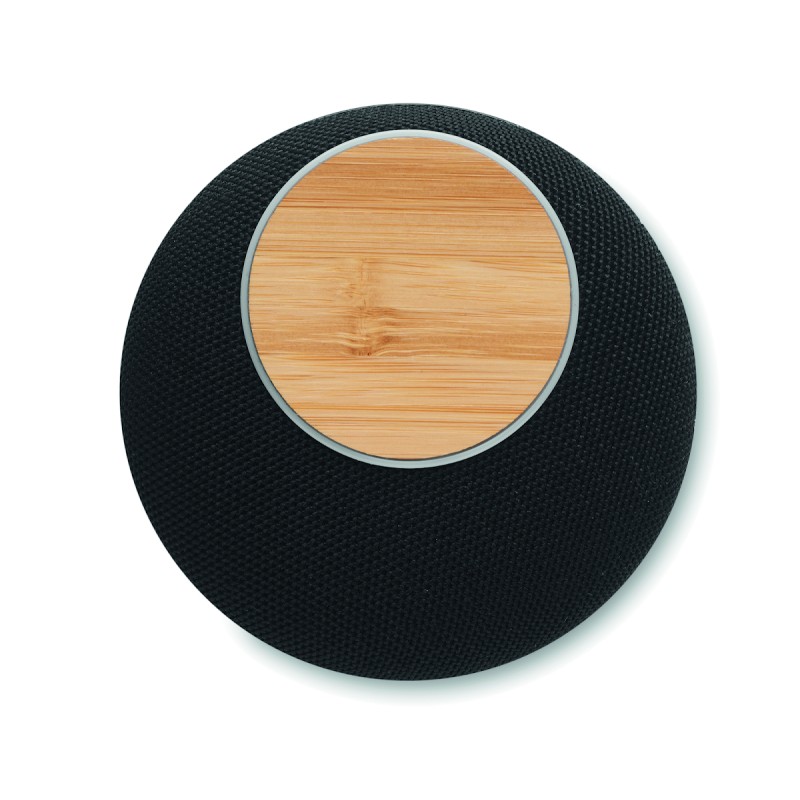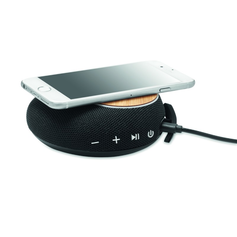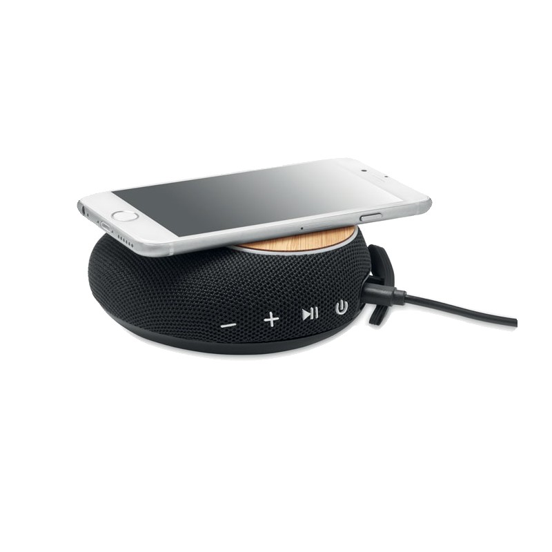 Haut-parleur sans fil 5.1 en boîtier ABS et bambou sur le dessus. Il dispose également d'un chargeur sans fil intégré de 10W et d'un powerbank de 4000 mAh. Sortie DC 9V/1.1A. Le bambou est un produit naturel, et présente de légères variations de couleur, de décoration et de tailles.