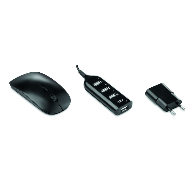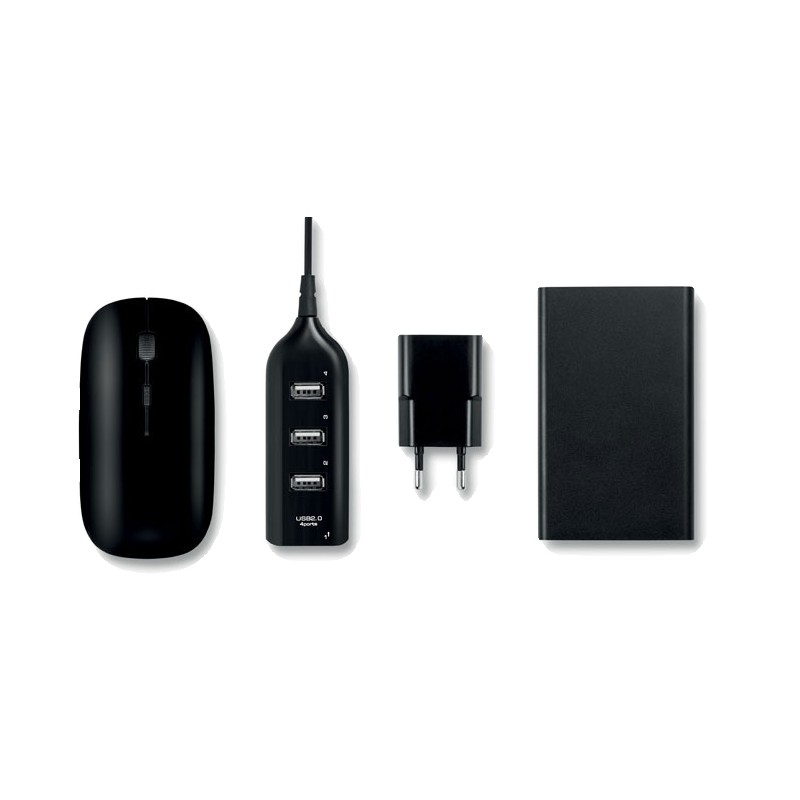 Accessoires informatiques en pochette EVA/PU qui comprend: 1 souris sans fil, 1 hub 4 ports USB 2.0 , 1 prise EU et un powerbank 4000 mAh. Câble de chargement micro USB inclus.