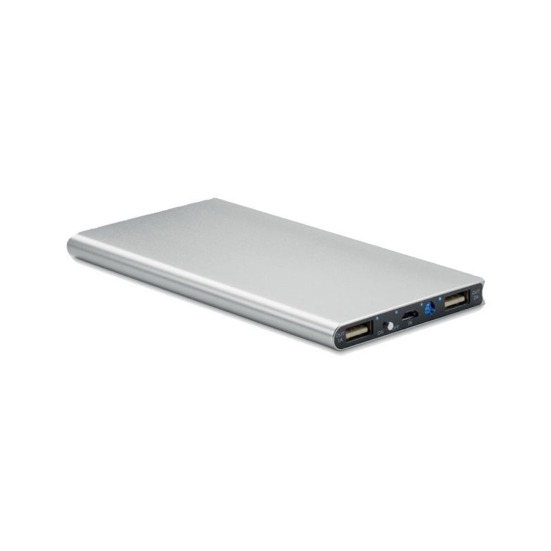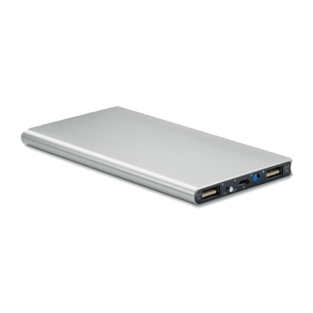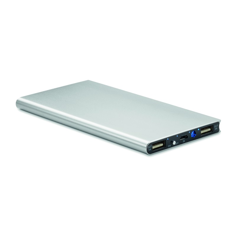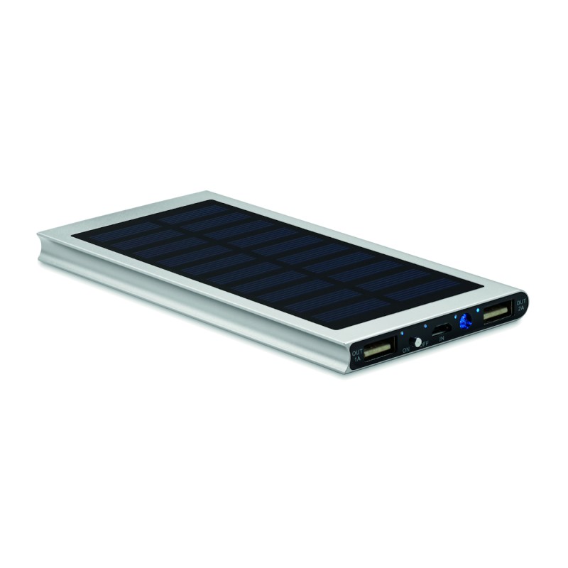 Chargeur externe 8000 mAh en aluminium recyclé avec panneau solaire. Peut-être utilisé avec un smartphone, sortie DC5V / 1A et DC5V / 2A. Comprend une lampe témoin et un câble USB avec prise micro usb. La fonction de charge solaire est conçue pour les situations d'urgence.