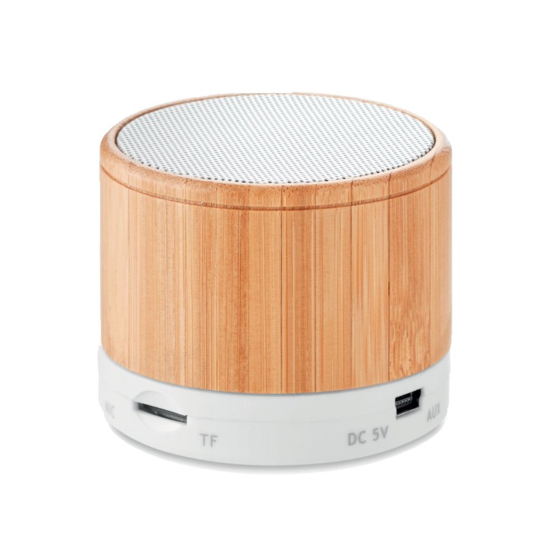 Haut-parleur sans fil 4.2 en ABS avec boîtier bambou. 1 pile rechargeable lithium 450 mAh incluse. Port de carte SD et un câble AUX / USB. Fonction appel mains libres. Sortie: 3W, 3 Ohm et 5V. Le bambou est un produit naturel, et présente de légères variations de couleur, de décoration et de tailles.